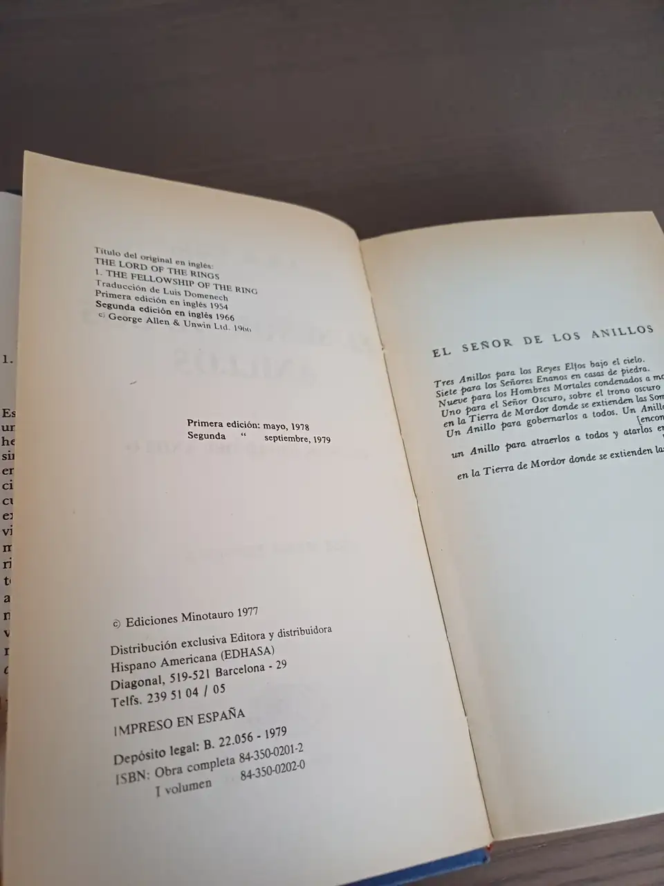 ¡Qué va! El primer volumen es una 6ª edición de mayo de 1980 (en dos años se hicieron seis ediciones), en cambio el II y el III sí son primeras ediciones de 1979 y 1980, respectivamente. “El Hobbit” es una 2ª edición de abril de 1982.Que bueno. Yo tengo la segunda edición, que es del 79, debe ser como la tuya.