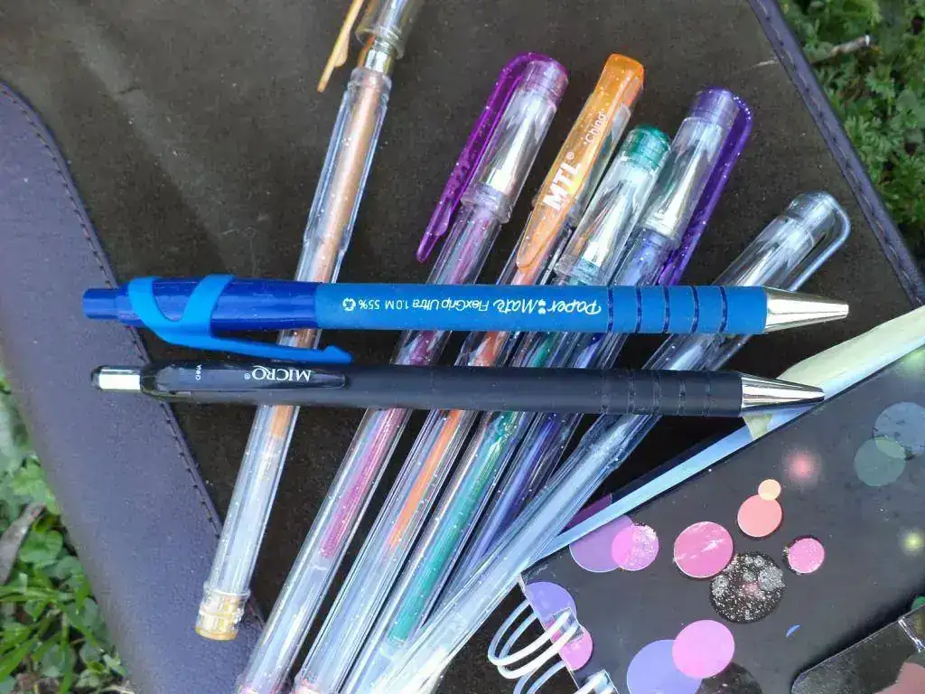 4) Amo los bolígrafos Micro y Paper Mate: aquí retratados hay dos; y debajo de ellos, unos bolígrafos con tinta gel de colores muy llamativos que utilizo para marcar destacados en hojas, mis agendas, notas, etc...