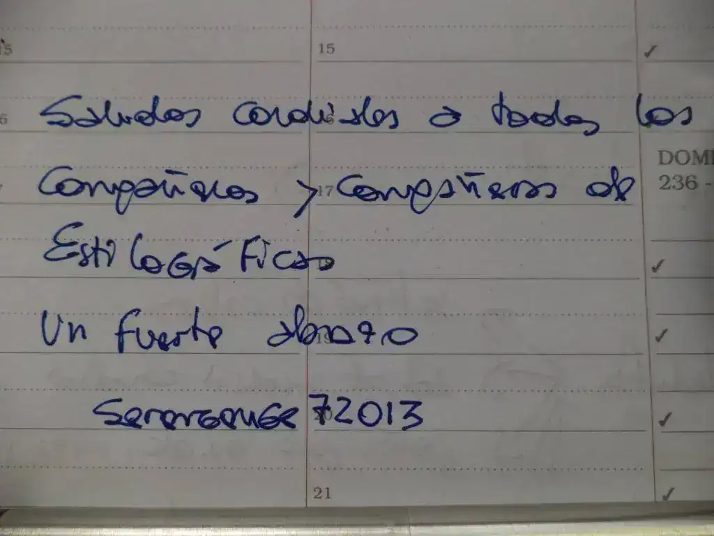 5) Mensaje escueto y pulcro de vuestra compañera para ustedes... ¡¡¡ mi letra es un horror !!! Mi firma es mi antiguo nick, y que sigo utilizando regularmente. Lo del cambio de nick se los contaré; pero no ha sido deliberado. No se si alguno de ustedes se ha visto forzado a decir quién es... aunque no quiera. Pues ha ocurrido eso, no me ha quedado alternativa....