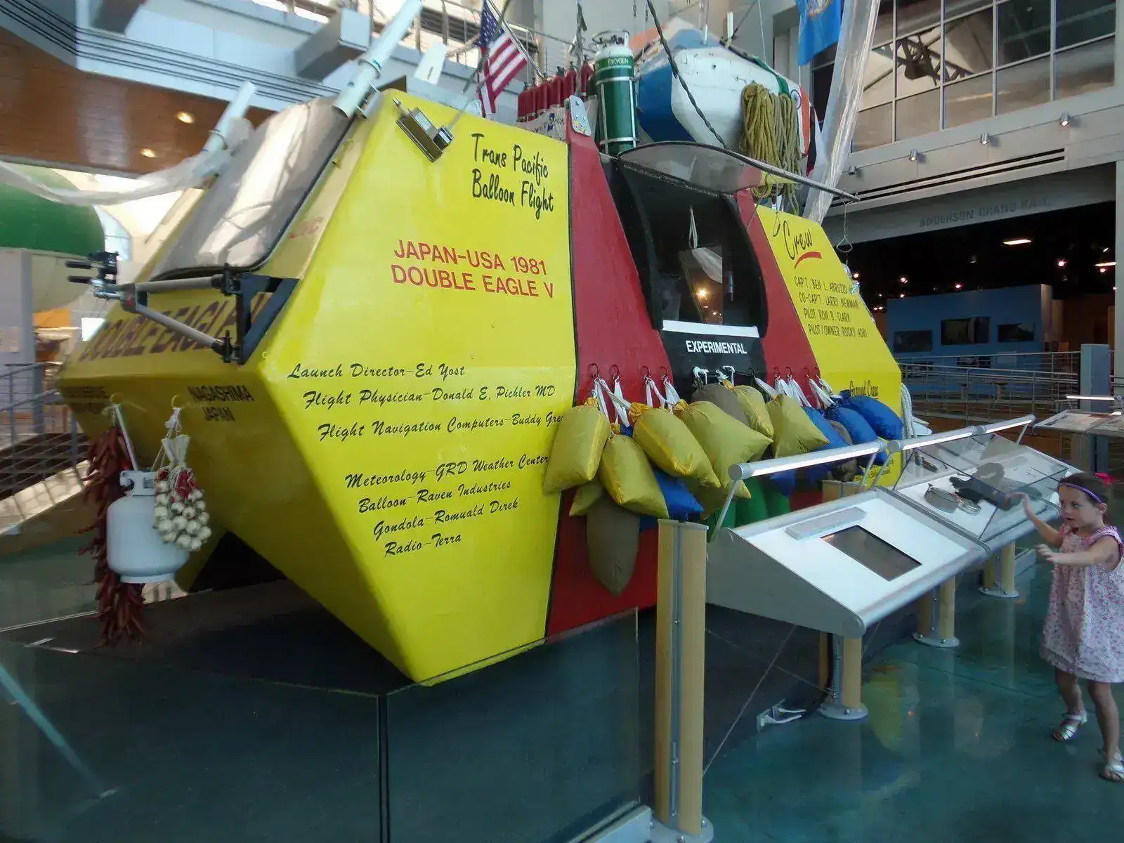 En exhibición está también la góndola de la Jules Verne: dos intentos fallidos de circunvalar el globo por parte del binomio Abruzzo-Anderson. También está la góndola del Doble Eagle V que fue el primer cruce del Pacífico exitoso de la historia en un globo en el que participaron Abruzzo, Newman, Ron Clark y Rocky Aoki.