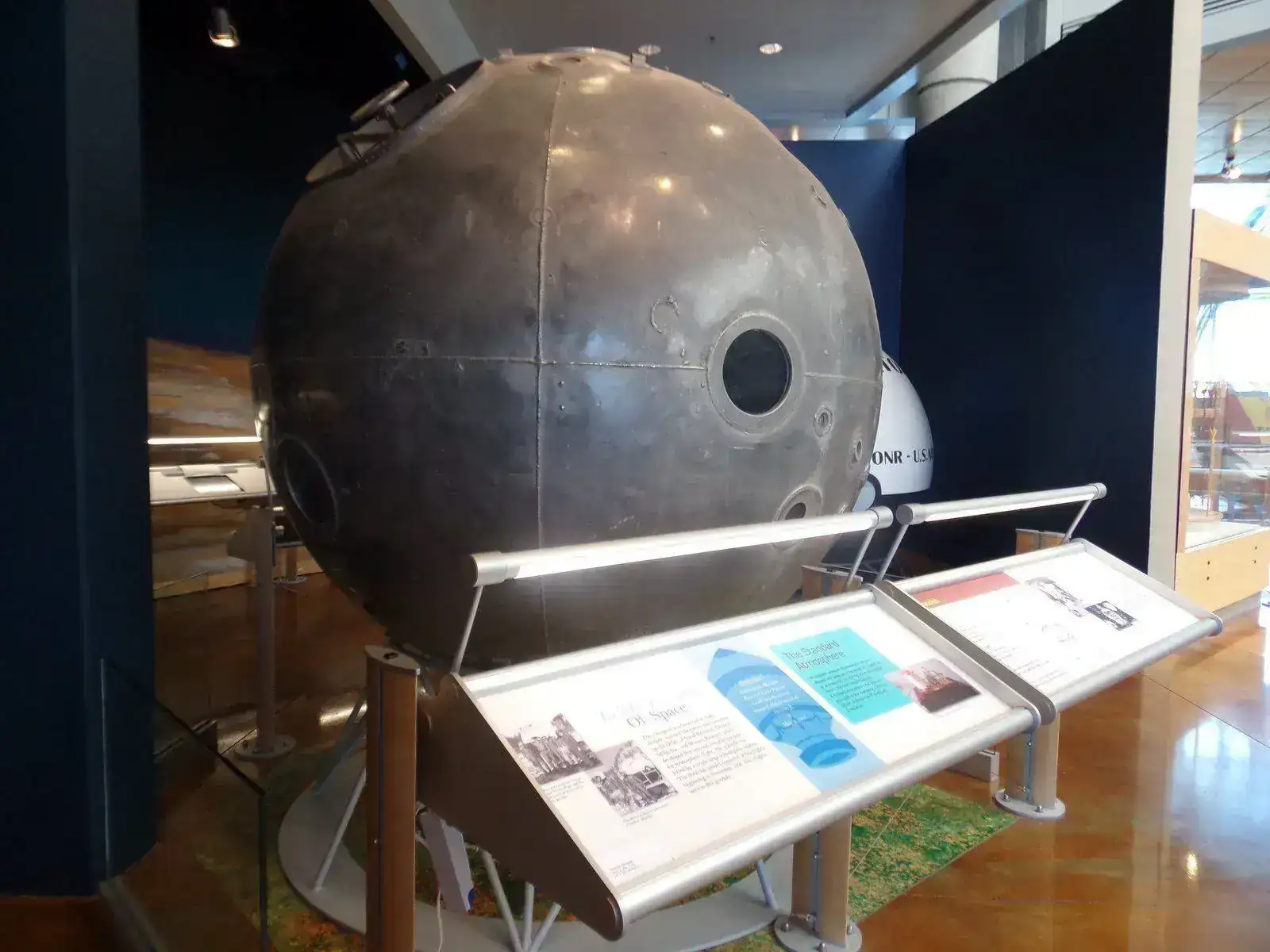 Del globo laboratorio se conserva la góndola. Una esfera claustrofóbica que pertenecía a la Inteligencia Naval de USA que ascendía por un globo de politropileno y que se estacionaba en la estratósfera para experimentos y pruebas. Con la góndola-esfera que se ve en la foto se hicieron 4 de los 5 vuelos.