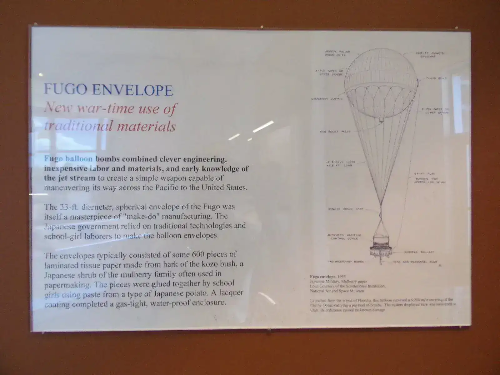 Quería mostrarles el Fugo-bomba. El Fugo fue un invento japonés que combinó niñas de escuela, ingeniería y astucia. Se trataba de una bomba que pendía de un globo hecho con papel tissue de árbol de Koso y ensamblado por estudiantes con cola fabricada con papas. Estas singulares armas aprovechaban los vientos del Océano Pacífico que podían arrastrarlos hasta USA.