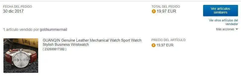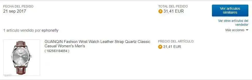 El primero fue el de color gris y pagué por él 31.41 euros todo incluído en septiembre del año pasado. Era difícil de encontrar porque el anuncio estaba mal y hablaba de un reloj de señora de cuarzo, pero no era así, en la descripción era correcto y me arriesgué pensando en que si me enviaban el de cuarzo lo devolvería y, si no, la pérdida tampoco era importante.