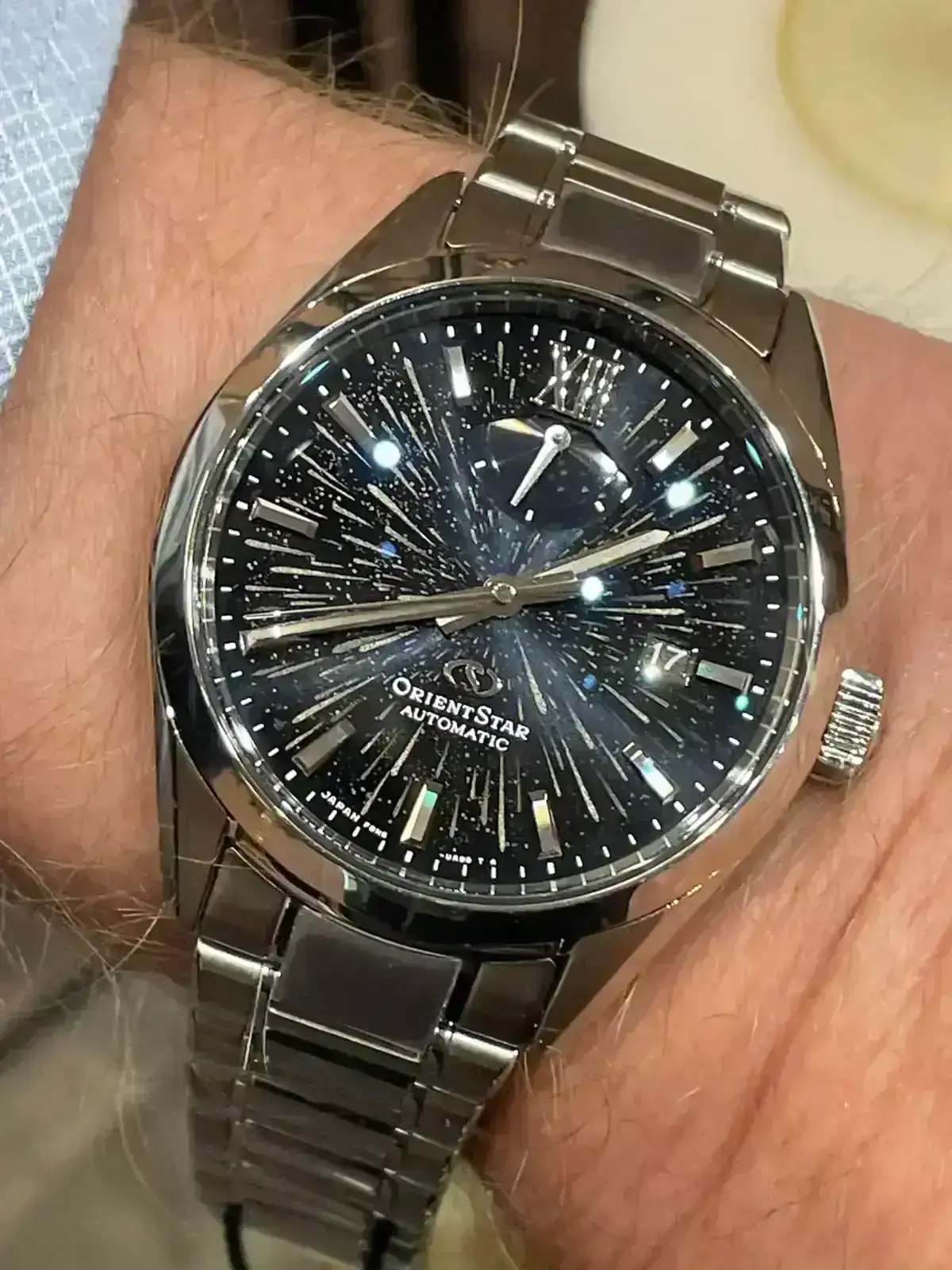 "esfera negra especial que incorpora lo que Orient describe como una "tecnología multicapa de nanopartículas metálicas", pionera a nivel mundial, que crea un efecto similar a una lluvia de meteoritos (algo que realmente merece la pena ver en persona)"![]()
