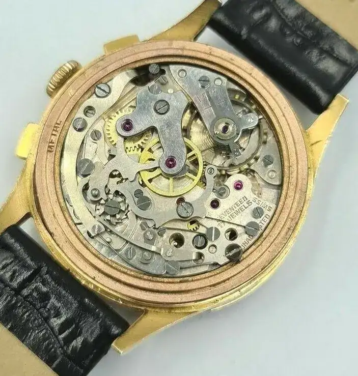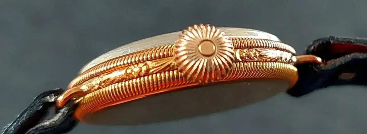Problemas tienen cajas hechos de 6 gramos de oro, si que hay, por ejemplo los famosos CHRONOGRAPH SUISSE de oro. Las asas son huecos y en el interior hay otra caja de laton, para que no se dobla el reloj y se cae todo encima. Muchos tienen doble fondo, el de laton y el de fuera en oro, poco mas que papel de aluminio, un decimo algo asi. Aqui es uno, pero hay peores. Son de los tiempos despues de la 2.GM, para que todos pueden llevar un reloj de oro el domingo en la iglesia.