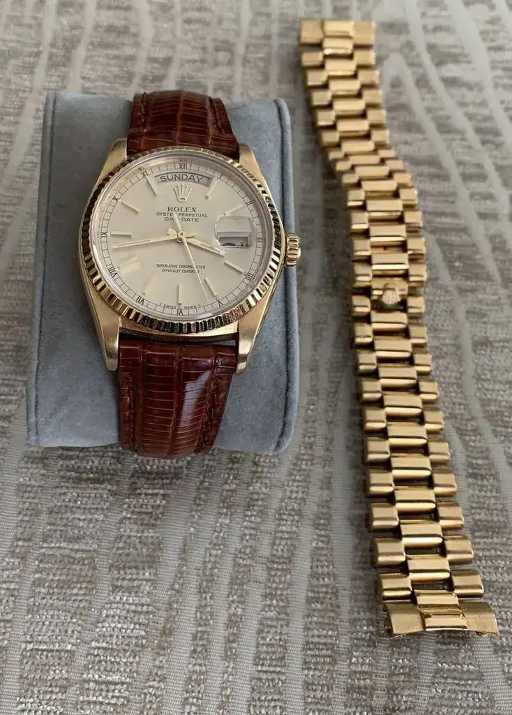 Solo para decirlo, DayDate ref 1803 se vendian en su tiempo con brazalete president, o con correa de cocodrilo de 20 mm y ardillon de 16 mm.Pues yo voy a romper una lanza en favor de los "cigalas" discretos.