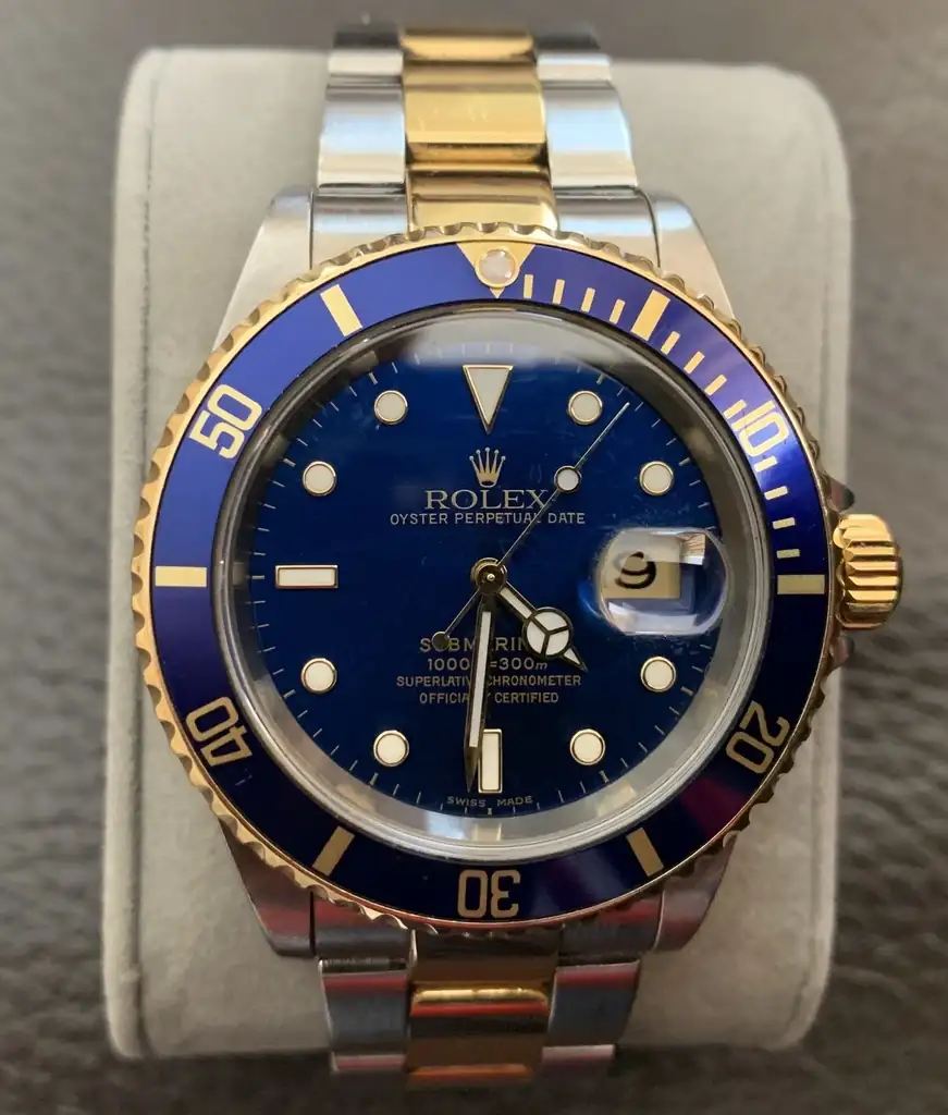 Y este es el que más me gusta de mi colección. Mixto, con oro amarillo y esfera y bisel de colorines ¿Quien da más?