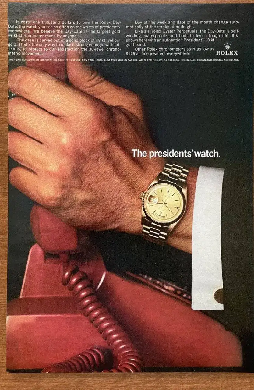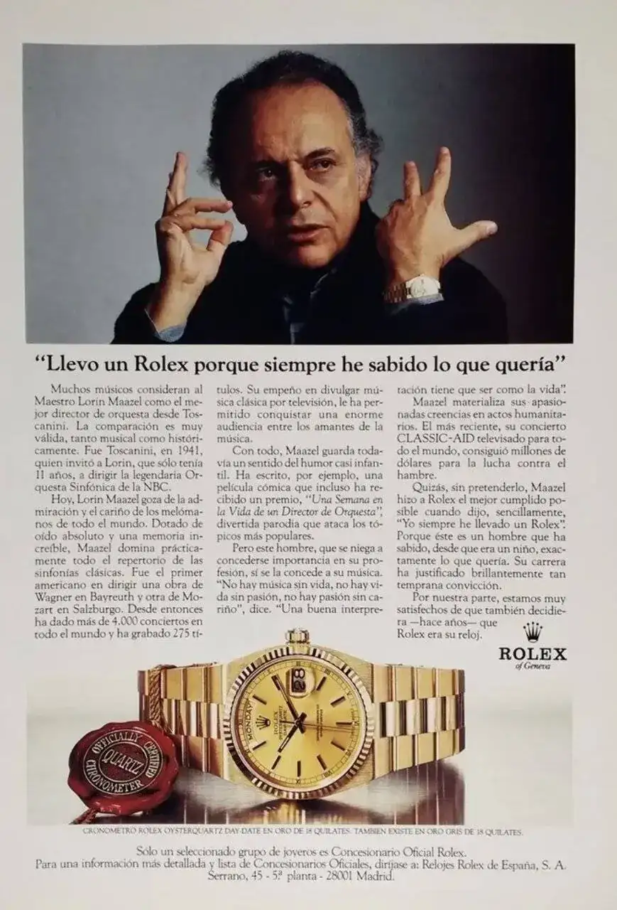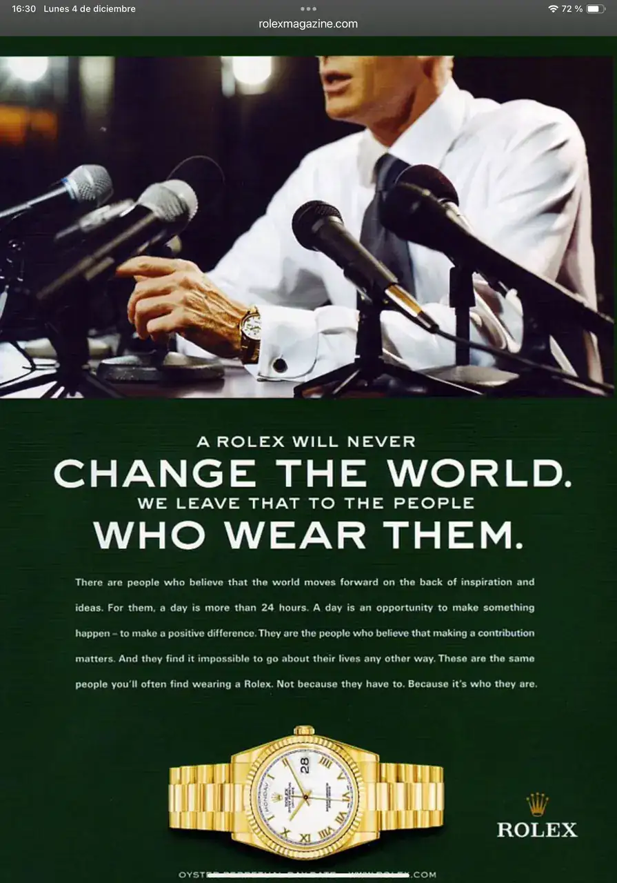 Es por ello, que voy a poner en este hilo unos cuanto menos sorprendentes anuncios de relojes de oro, todos ellos vinculados a personas que destacan en el ámbito profesional(no hablamos de cualidades personales) a nivel mundial. A ellos, como actores y personas de gran poder político no les sientan estos relojes como “cigalas” sino todo lo contrario. Parece que son el equipamiento idóneo para personas que desempeñan esas tareas.