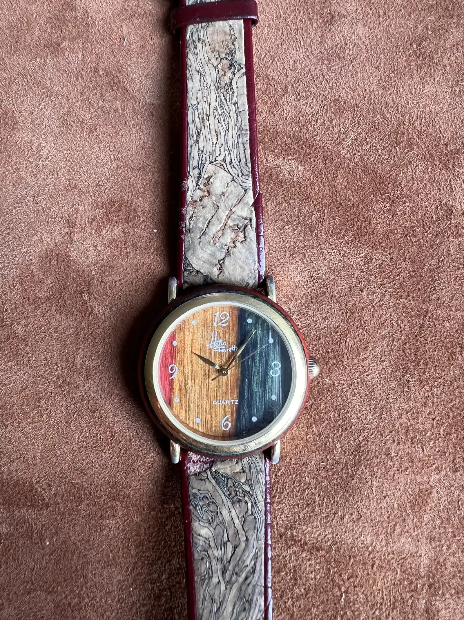 Uno o dos años más tarde, la empresa donde trabaja mi padre me envía de regalo navideño el que sigue. Caja forrada en madera y correa con una lámina de corcho. Nunca me entusiasmó, pero bueno, se llevó su uso.