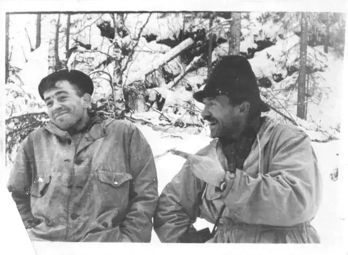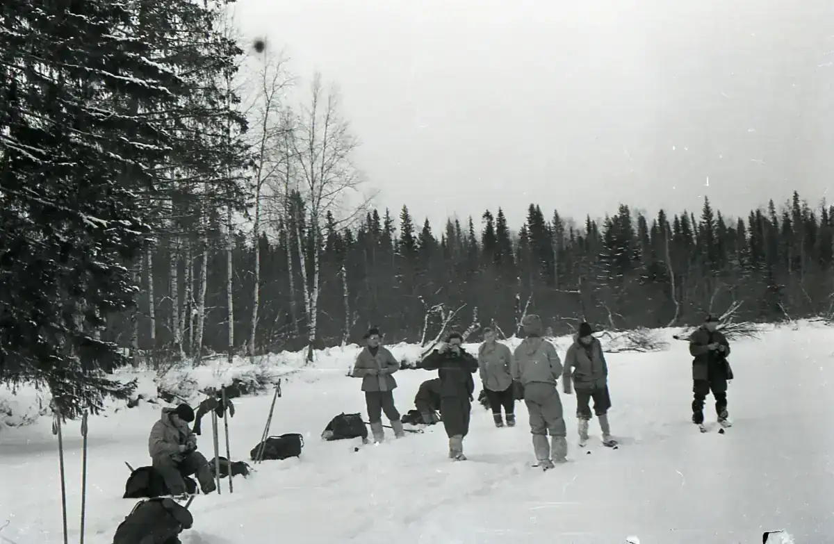 El grupo preparando la tienda. Fotografía tomada el 1 de febrero a las 3 pm probablemente con la cámara de Diatlov. Fuente: Dyatlovpass.com