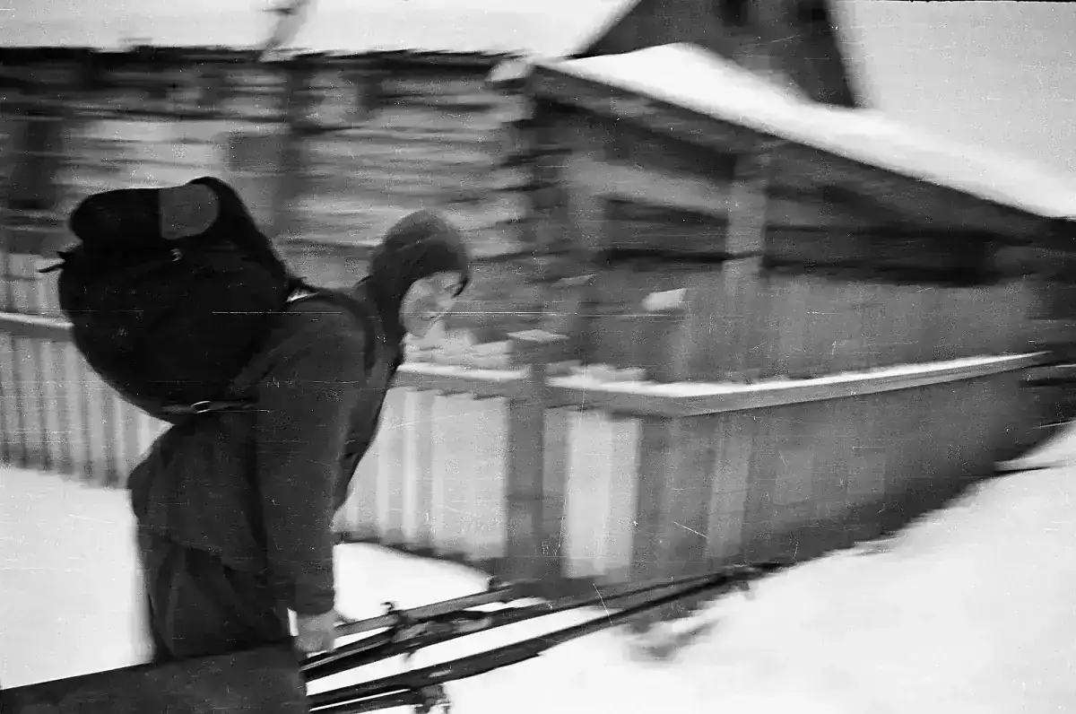 Fotografía extraída de la cámara de Krivoníschenko en la que vemos a Igor en primer plano llevando la tienda enrollada en su espalda. Fuente: Dyatlovpass.com