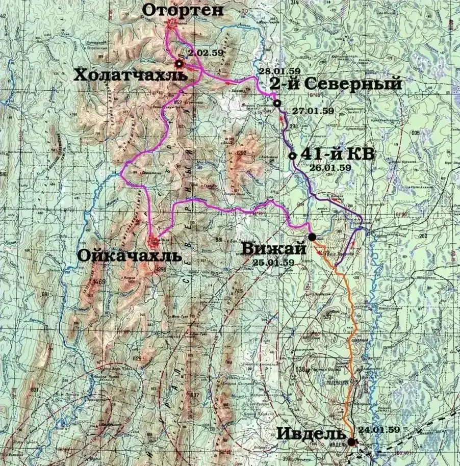 El 23 de enero de 1959 el grupo toma el tren Nº45 de Ekaterimburgo a Serov, a donde llegan la mañana del 24. Desde allí cogen otro tren hacia Ívdel, llegando el día 25 y partiendo directamente en autobús hacia Vizhái, pueblo desde el que salen las expediciones a Otortén y último pueblo habitado en la ruta.