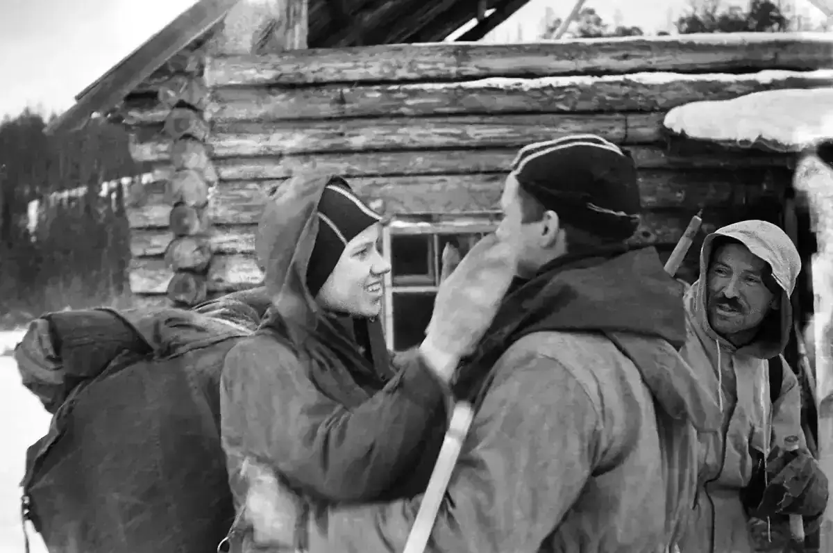 Kolmogórova despidiéndose de Yuri Yudin. Cámara de Krivoníschenko. Fuente: Dyatlovpass.com