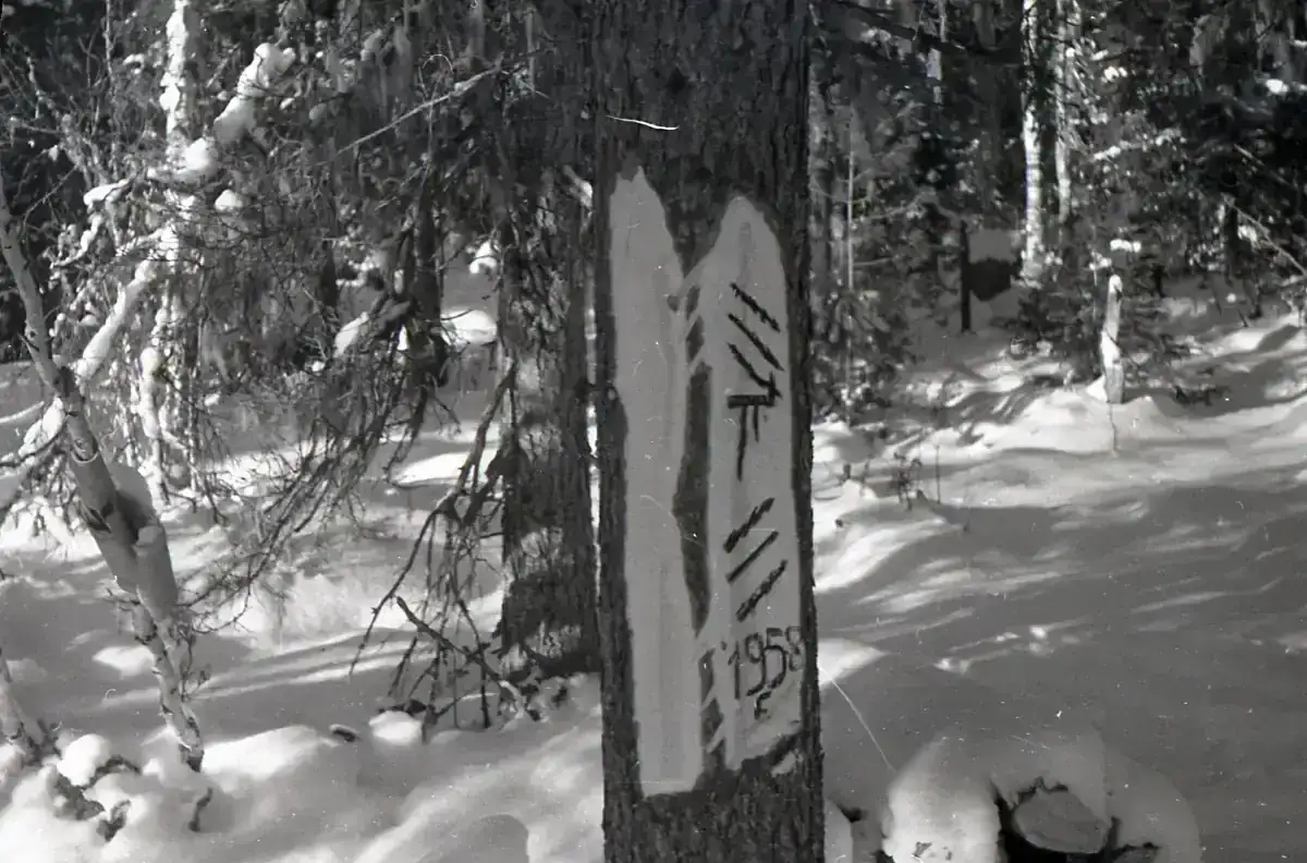 Señales Mansi talladas en un árbol en la ruta. Cámara de Krivoníschenko. Fuente: Dyatlovpass.com