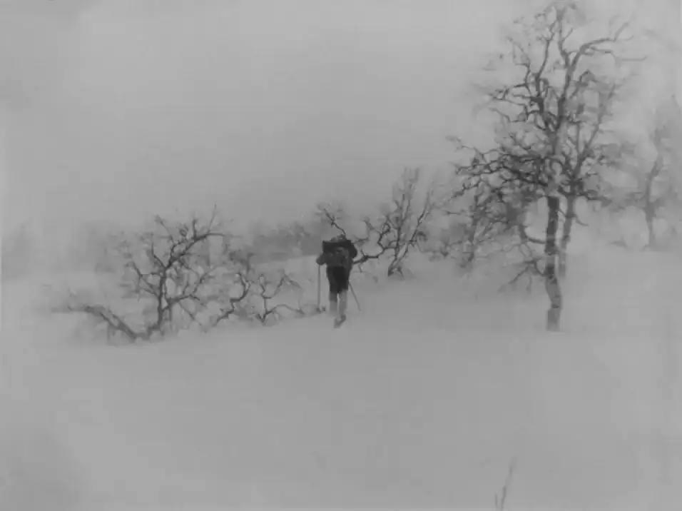 “Hemos tenido una noche sorprendentemente buena, el aire es cálido y seco, aunque estamos a entre -18 y -22ºC. Caminar es especialmente duro hoy. No vemos el camino, no podemos hacer más de 1.5 a 2 kilómetros por hora… El viento viene del oeste, cálido, punzante, con la velocidad del reactor de un avión en el despegue…. Estamos exhaustos, pero empezamos a prepararnos para la noche. La leña escasea, todo abetos mojados. Hacemos una hoguera, la cena está en la tienda. Cómoda y cálida. No puedo imaginar tanto confort.”