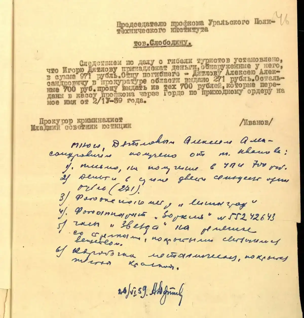 Recibo de entrega de pertenencias al padre de Igor por parte del fiscal Ivanov: “Las manecillas del Zvezda estaban recubiertas con una sustancia luminosa.” Fuente: svotrog1079.mybb.ru