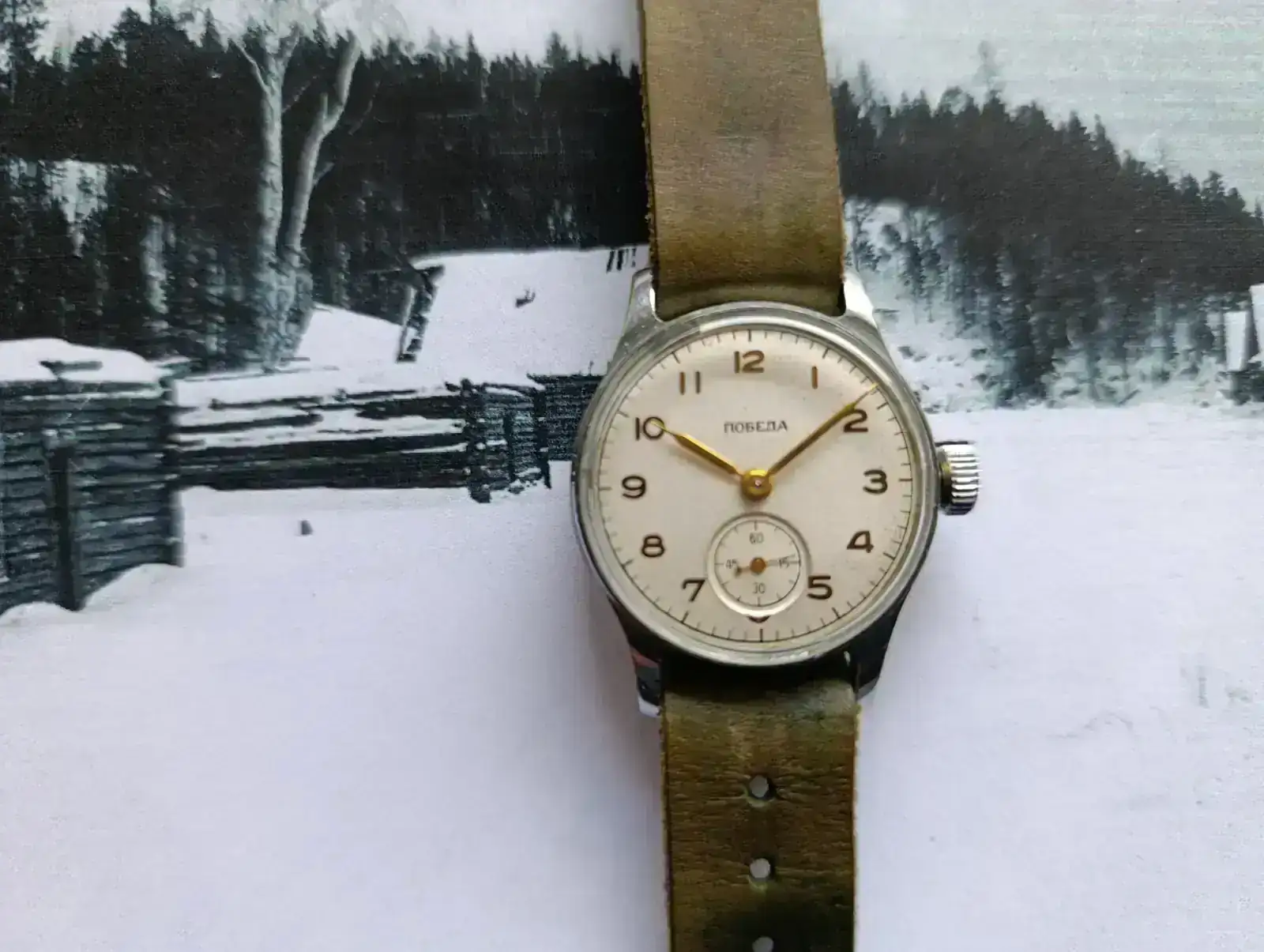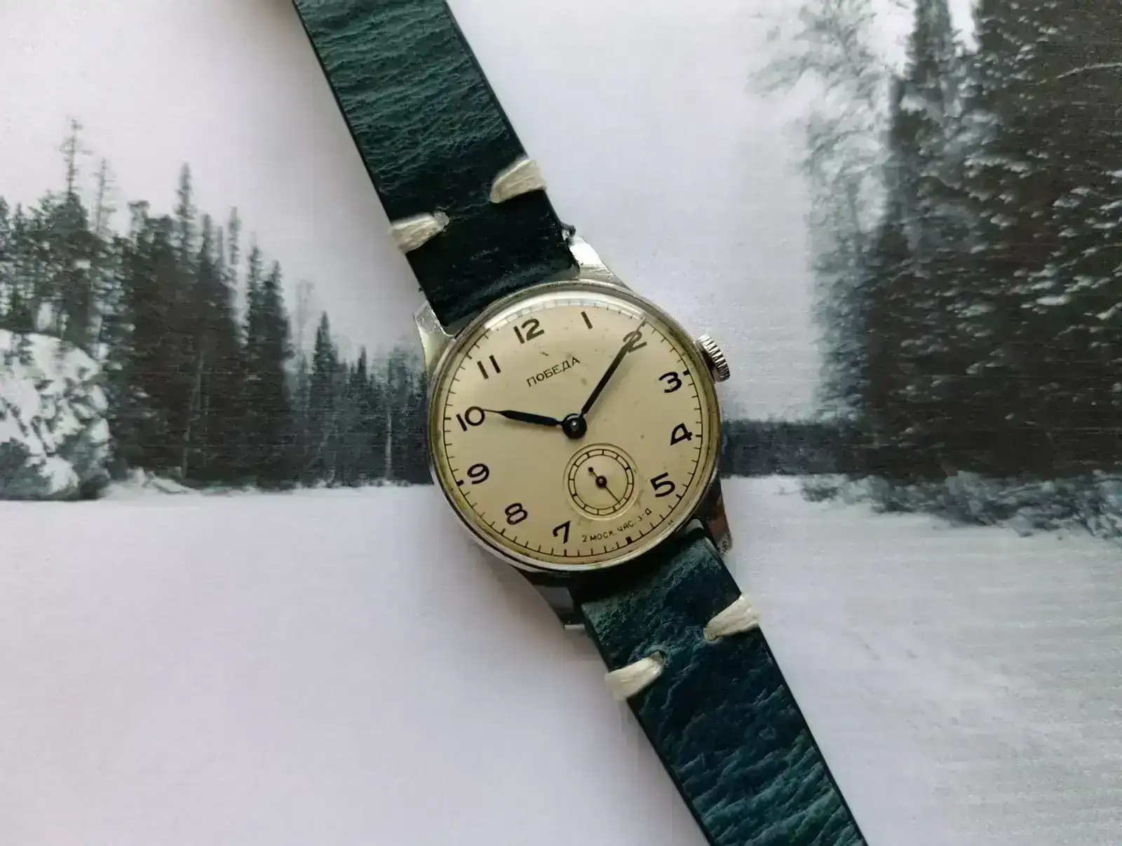 Viendo la imagen podemos suponer que se trata de un Pobeda con segundero a las 6 y agujas y numerales oscuros. Viéndolo en la muñeca de Rustem también parece tratarse de un Pobeda grande, de los de 32 mm de diámetro de caja. Hay multitud de Pobedas con esta configuración, siendo el más habitual el modelo 802K.