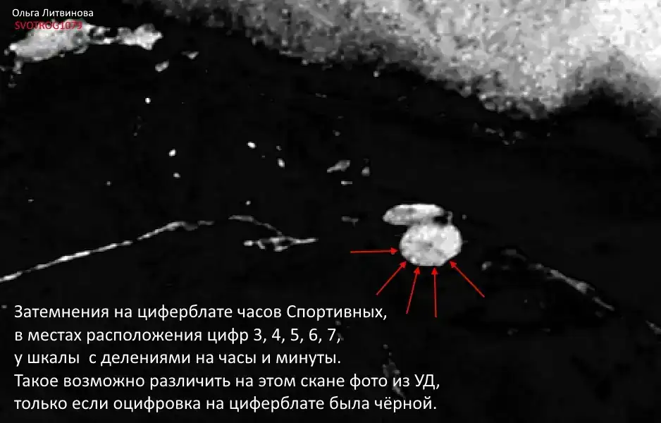 : "En su muñeca hay un reloj marca Zvezda mostrando las 8:45." Se trata de un error ya que, aunque la autopsia dice Zvezda, todos los demás documentos mencionan que se trataba de un Pobeda, lo que coincide con las fotografías.