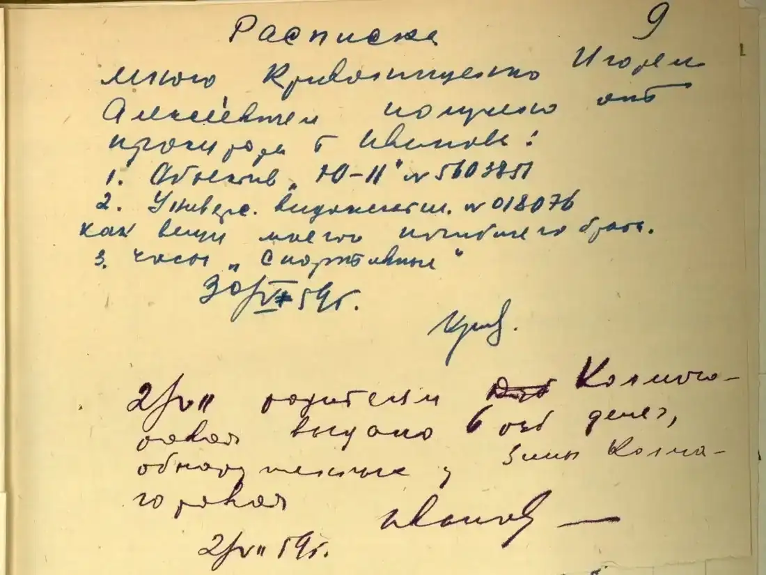 Recibo de entrega de pertenencias a Igor Alekseevich Krivoníschenko por parte de Ivanov. En el punto 3 podemos leer: “Un reloj de muñeca Sportivnie"