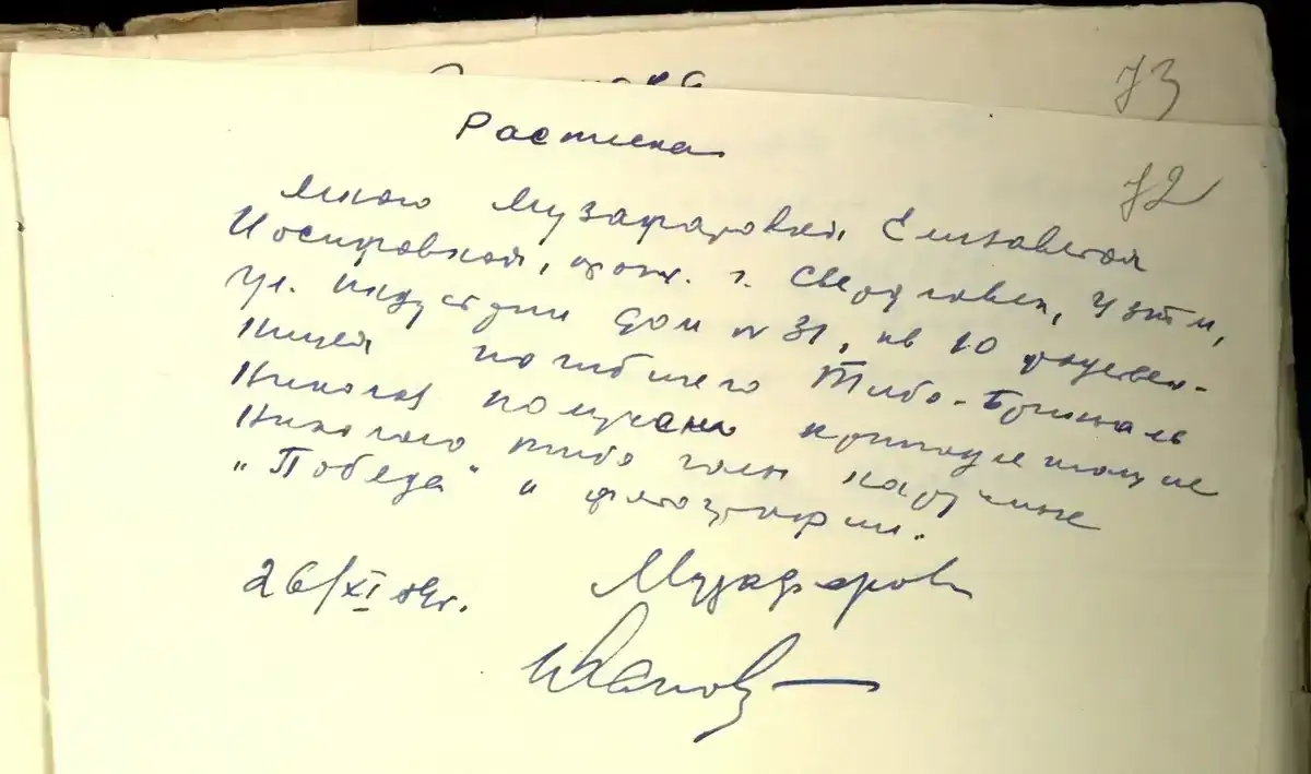 En el recibo de entrega de pertenencias a I, Elizaveta Iosifovna Muzafarova podemos leer: “I, Elizaveta Iosifovna Muzafarova,... recibió un reloj de pulsera Pobeda... perteneciente a Nikolái Tibo."