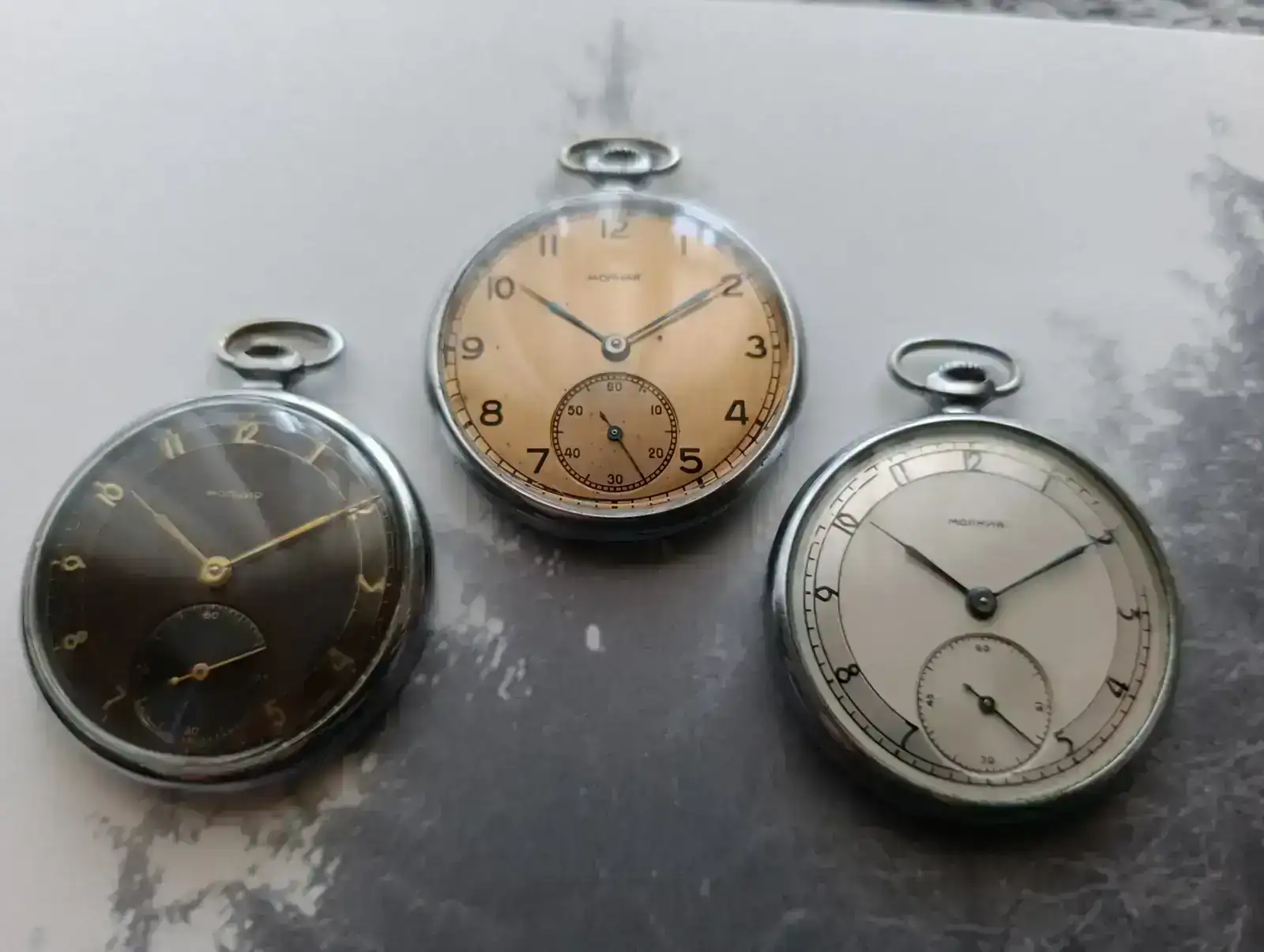 Y una vez más tenemos un montón de Pobedas con agujas y numerales claros, casi siempre dorados, tanto con segundero central como con segundero a las 6. Por el tamaño del reloj en la muñeca de Nikolái diría que es un modelo grande, probablemente con segundero central.