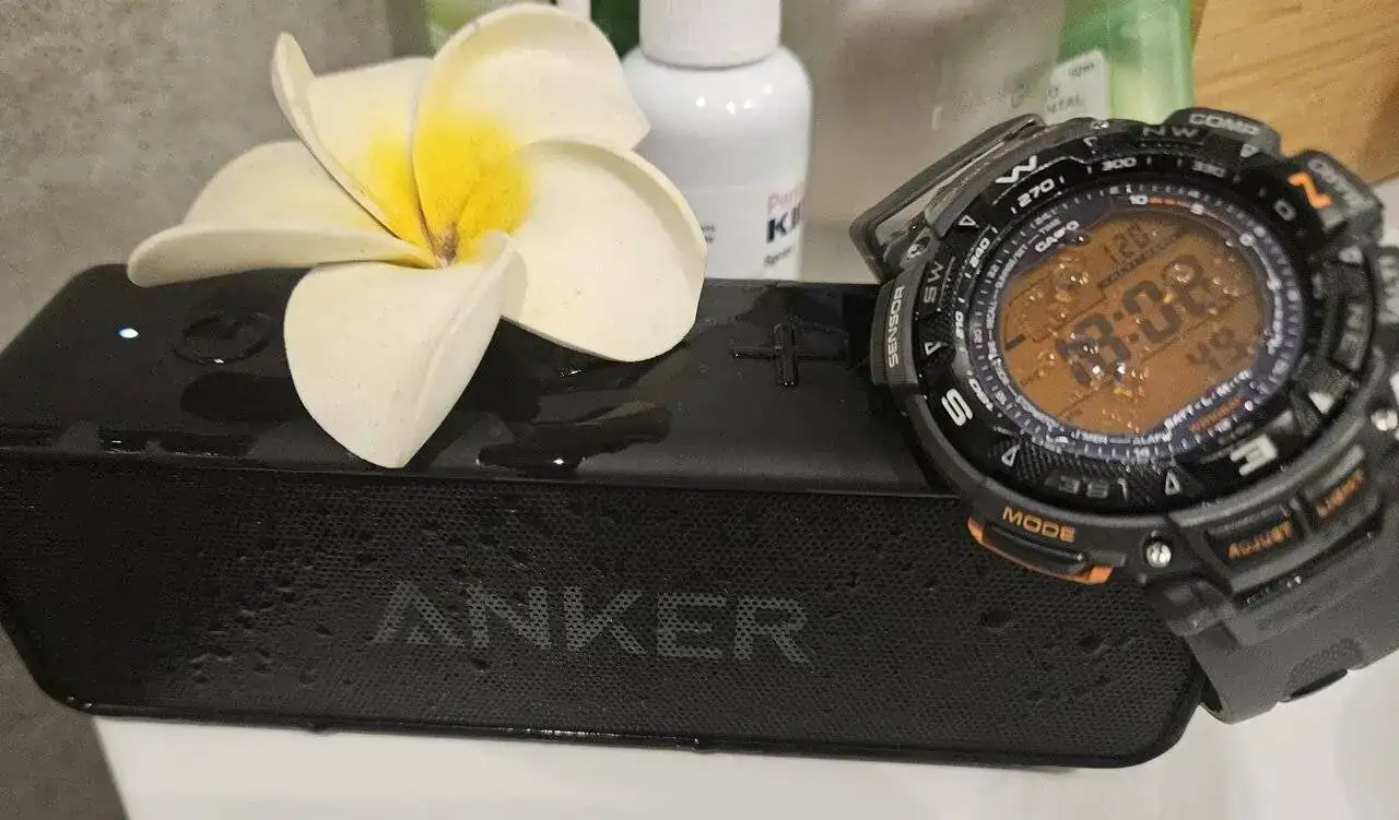 Vale para ducharse. Son 100M de resistencia al agua pero no le pasa nada por tenerlo puesto en la ducha, ni agua caliente ni vaho ni leches. Aquí con mi setup de ducha. El altavoz también es water resistant, de hecho lo pongo en la cesta de los geles, justo debajo de la ducha y le cae agua constante. No pasa nada