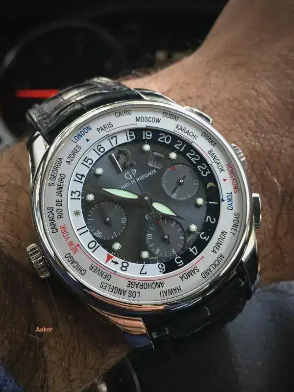 Hola Compañero Indy, me alegra que hayas encontrado por fin tu World Timer. Pero tengo que decirte que me causa una duda la foto que has puesto. Durante todo el hilo se les ha llamado igualmente a los Horas del Mundo activos y a los pasivos. Supongo que sabéis cuál es la diferencia. Los activos llevan un disco con las horas que gira solidariamente con la horaria pero en sentido contrario y que te dice en cualquier momento la hora en los veinticuatro husos horarios. Los pasivos son los que tienes que mover el disco de las ciudades hasta hacerlo coincidir con la horaria para saber en ese momento las horas en el mundo.