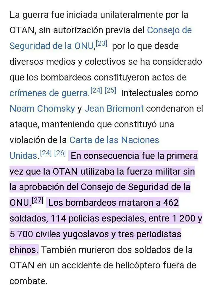 Curiosas las cifras que dices porque según los mismos datos serbios se estima que la cifra de civiles muertos fue aproximadamente de 2.500. Y Serbia encadenó a personas en los puentes para evitar que fueran destruidos o en su defecto contabilizarlas como victimas de un ataque de la OTAN. En cualquier caso estoy de acuerdo que fue una aberración.Noam Chomsky afirmó que Strobe Talbott, el subsecretario de Estado bajo el presidente Clinton y el principal negociador estadounidense durante la guerra, había escrito en su prólogo a "Collision Course: NATO, Russia, and Kosovo" de John Norris que "el verdadero propósito de la guerra no tiene nada que ver con la preocupación por los albaneses de Kosovo", sino más bien "fue porque Serbia no estaba llevando a cabo las reformas sociales y económicas requeridas, lo que significa fue el último rincón de Europa que no se había subordinado a los programas neoliberales dirigidos por Estados Unidos, por lo que tuvo que ser eliminado".