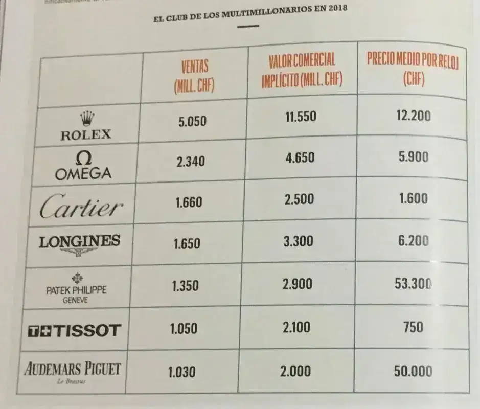 Me llama mucho la atención la última columna “ Precio medio x reloj”. Que Longuines este x encima de Omega y Cartier, cuando sabemos q no es así, estoy seguro q han bailado las cifras con Cartier q le han puesto precio medio x reloj 1.600 y a Longuines 6.200.