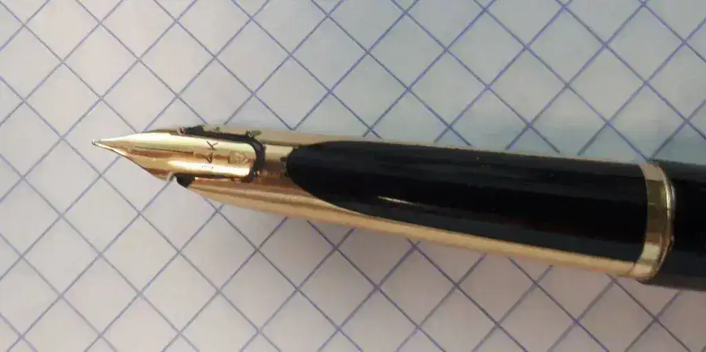 Plumín 14k integrado, flexible. El punto creo que es F, tiene un trazo fino.