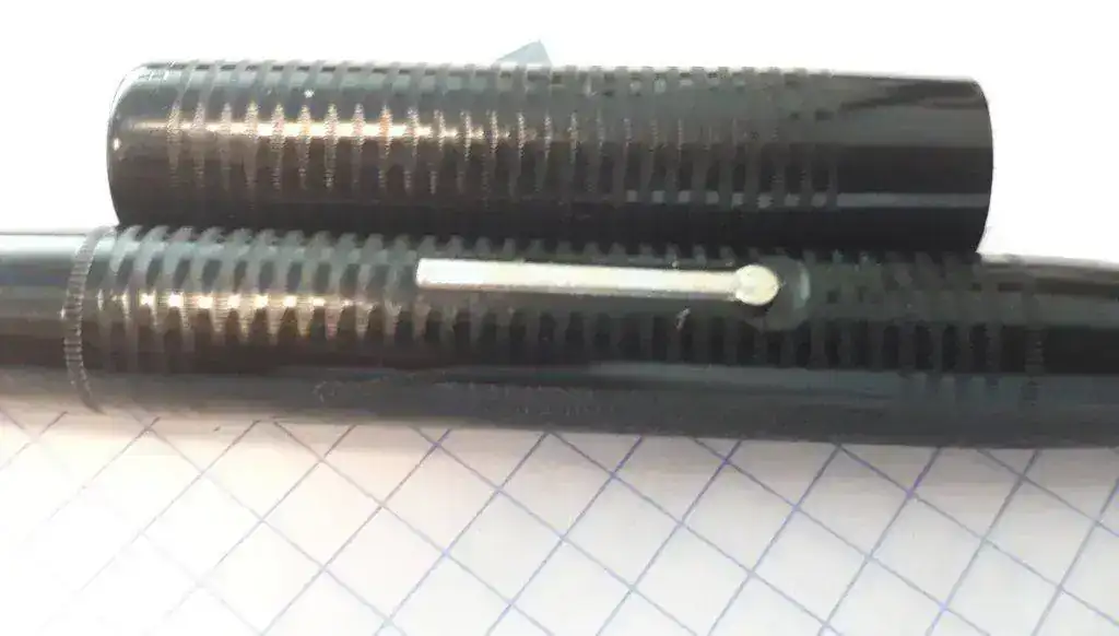 Este modelo debe ser aprox. de 1925. Sistema de Palanca. Fabricada en ebonita de color negro con patrón de grabado “Chased”.