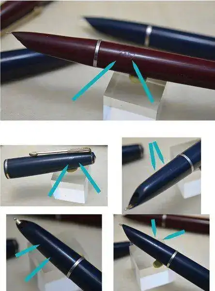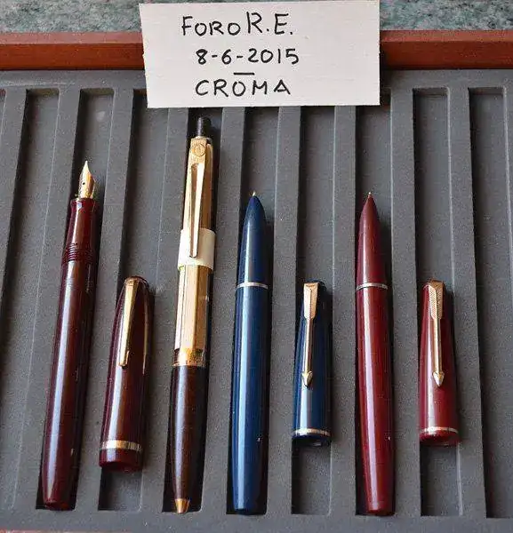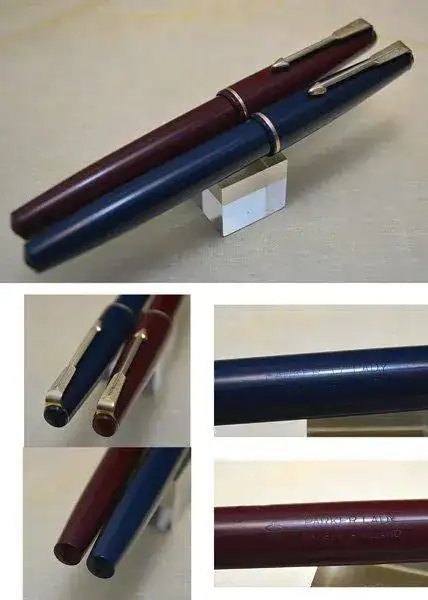 Lote de dos PARKER 17 LADY (c. 1964) fabricadas en Inglaterra. Una en color rojo Burdeos con detalles en dorado y otra en Azul oscuro con detalles dorados. Plumín de oro de 14 kt en trazo M y F. Carga mediante sistema aerométrico integrado. Estado de conservación aceptable con signos de uso y desgaste con roces y pequeños arañazos. Defectos estéticos. La azul presenta arañazos en la sección de agarre y un arañazo marcado en la capucha; y la roja presenta una especie de quemadura o erosión en la base del cuerpo. En ambos casos no afecta al funcionamiento. Ver las fotos para mayor detalle.