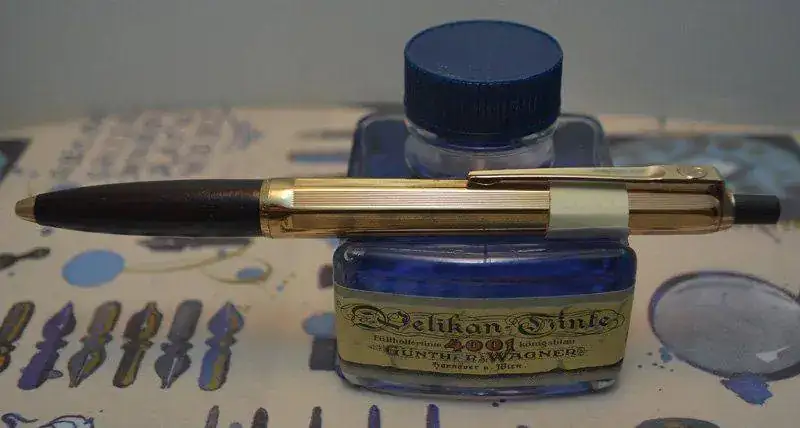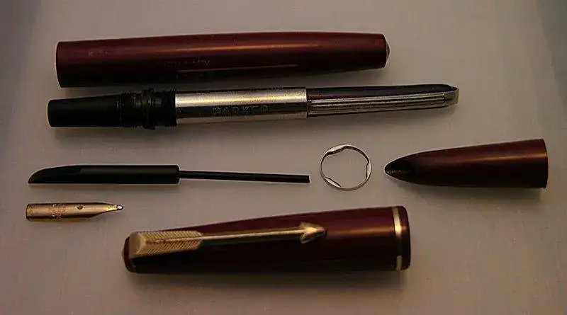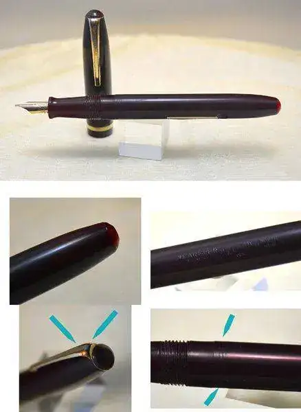Pluma estilográfica WEAREVER ZENITH modelo 195 fabricada en Estados Unidos, en color rojo Burdeos con detalles en dorado. Plumín original de oro de 14 kt con alimentador transparente. Carga mediante palanca lateral integrada. Estado de conservación aceptable con signos de uso y desgaste con roces y pequeños arañazos. Defectos estéticos. Presenta arañazos de roscado en el cuerpo debido a que la capucha rosca ajustadamente sobre el cuerpo y también desgastes del dorado en el clip de la capucha. Ver las fotos para mayor detalle.