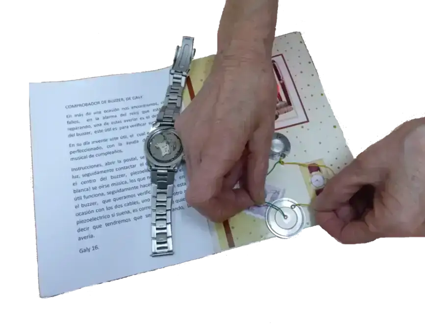 Sacamos punta a los terminales de las varillas, metálicas de paraguas. Soldamos los cables a los terminales, pasamos el cable por los palillos de plástico, y encajamos las puntas de conexión, desmontamos la postal, y en un lateral de la postal, hacemos un agujero, para pasar los cables, retiramos el altavoz (piezoeléctrico), en su lugar soldamos los cables de las puntas.