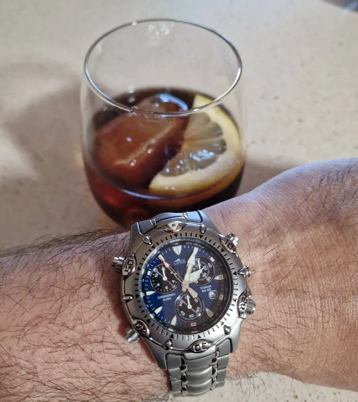 Disfruto del equipamiento y del poderío del Miyota 3S10, uso mucho la cuenta atrás tan cómoda y rápida de programar que tiene, disfruto con el precioso sonido de grillo de su alarma, también uso el bisel giratorio, el excelente crono de 12 horas, todo. Y además es comodísimo, se nota mucho la ligereza del titanio. Otros relojes, de acero y grandes, me gusta que pesen, pero este es diferente, es de titanio, una de las cosas que me gustan de él es precisamente que no pesa. Del titanio me gusta también la calidez que tiene en el momento de ponértelo, aunque eso se nota y disfruta más en invierno. Ahora ya le va a tocar descansar, que además me fastidiaría mucho hacerle un rozón ahora que vamos sin mangas. Al fin y al cabo es un reloj de colección, no es un Miyota 3S10 cualquiera ni un Lotus cualquiera, es un clásico entre los clásicos de los 90, y ya que escapó de su época en tan buenas condiciones, hay que cuidarlo como merece, disfrutándolo con tranquilidad. Y no porque sea frágil precisamente, que este tiene hasta su test de hermetismo hecho, con sus wr. 100m intactos, aunque en el agua no entra ni de broma, pero podría.