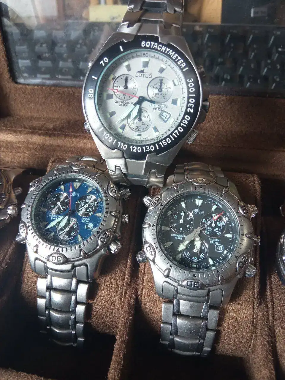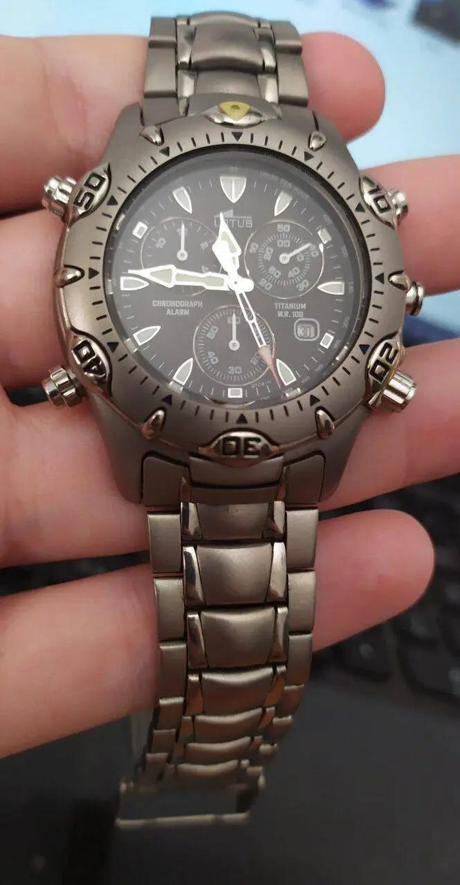 El Lotus All Titanium 9665 con esfera de ondas grises es un clásico entre los clásicos. Cualquier reloj que monte el 3S10 fue un buen reloj en su época, sobre todo los 90's, y lo sigue siendo hoy, pero algunos modelos brillaron con luz propia. En los 90 se puso de moda el titanio, se popularizó gracias a marcas como Citizen y Lotus que bajaron este metal precioso de las altas esferas a las casas de la gente normal. El Lotus con Miyota 3S10 no era barato, y los modelos de titanio eran los más caros, pero tenían un precio muy ajustado para la gran máquina que llevaban dentro y para estar hechos de un metal que hasta hacía poco había sido un lujo. Y entre los Lotus Titanium, hubo uno que protagonizó la publicidad de la marca en 1995 y 96 cuando sacaron la colección Titanio, el Lotus 9665 de esfera negra con ondas grises y agujas y detalles dorados, el gran clásico.