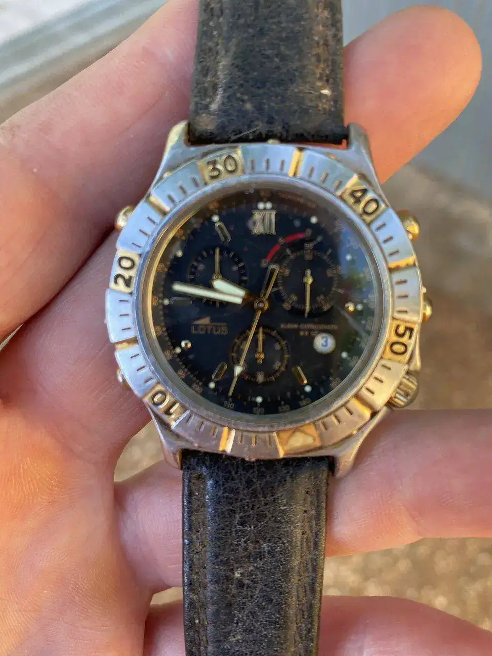 Los detalles de la esfera resaltan mucho con los tonos oscuros, y además de la legibilidad perfecta, el fondo negro casi totalmente cubierto por ondas grises, salvo en la periferia de las subesferas con un negro brillante, y los detalles dorados de agujas e índices, con la segundera roja y un lumen que coge un tono ligeramente verdoso nada más darle la luz, hacen una esfera preciosa, difícil de superar para mi gusto en su estilo. De verdad, visto al natural el reloj gana mucho, es una aténtica belleza. Quizá también juega en todo esto esa sensación de que tienes un clásico en las manos, pero es realmente hermoso, en el conjunto y en sus detalles. Me encanta también el tamaño y forma de la caja, muy compacta y con un derroche de barroquismo noventero, típico de la época pero con mucha personalidad propia en estos Lotus.