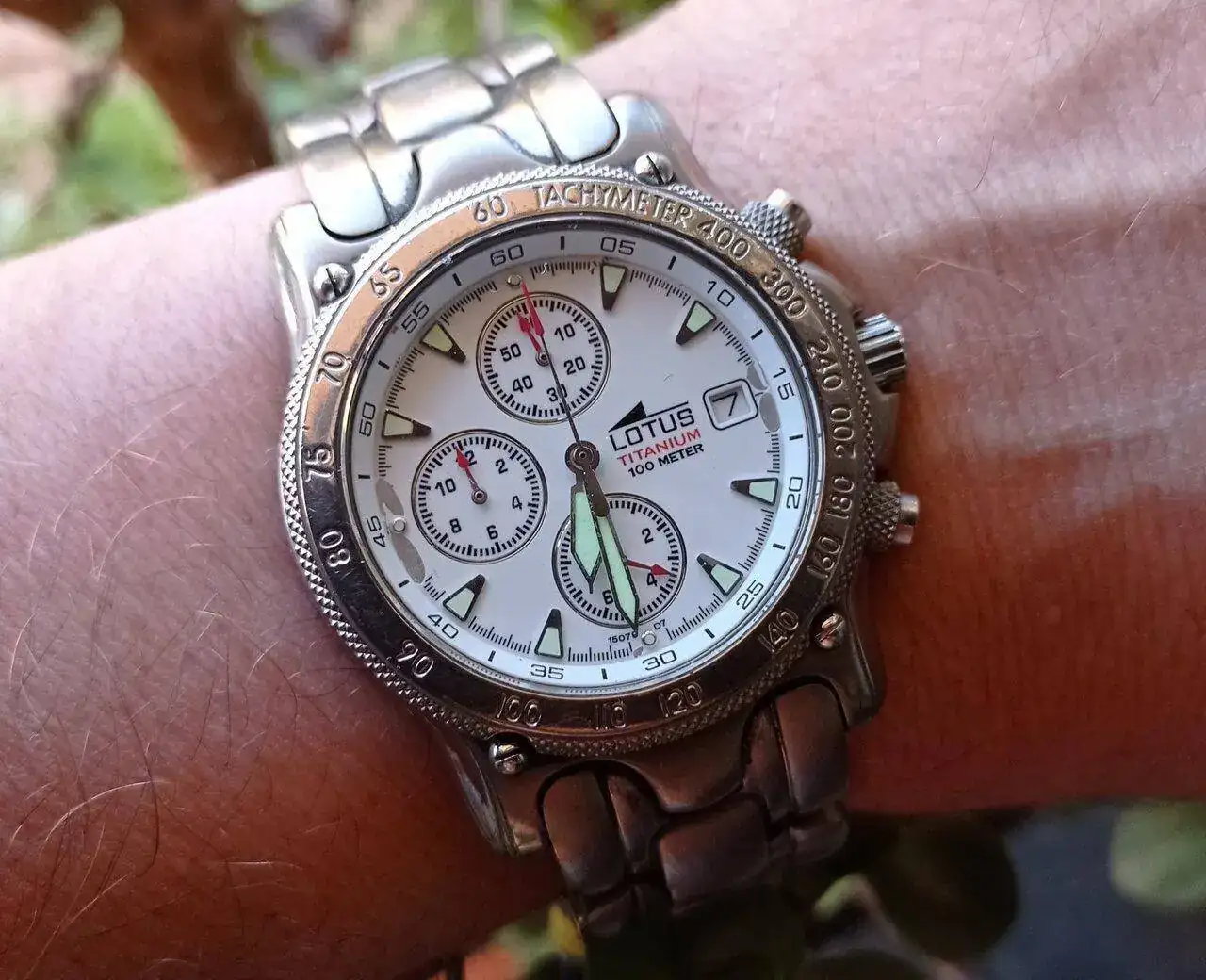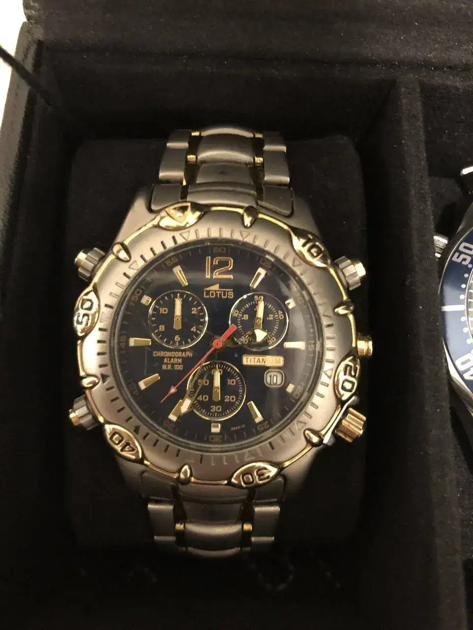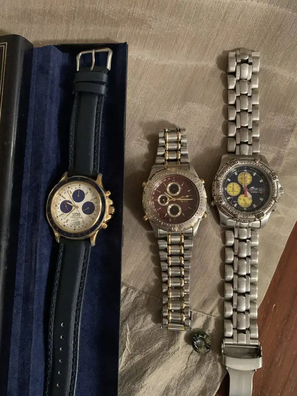 Tus Lotus muy bonitos también, el del centro con su Miyota 6W50 es un portento de funciones y un reloj entrañable a estas alturas, ¿en qué familia no hubo alguno hace treinta años? Sería alrededor de 1990 cuando mi padre compró el suyo, que aún conserva, y me gustaba tanto que se lo cogía para pulsar los botones; las agujas empezaban a moverse para todos lados y yo no sabía cómo pararlas, así que dejaba el reloj en su sitio y a saber cómo se lo encontraba mi padre, todo desconfigurado. Yo no entendía cómo funcionaba, pero me encantaba ver tanta agujita bailando. Tu Lotus 6W50 es muy bonito, me gusta mucho la combinación de granate con los detalles dorados, es un reloj muy noventero.