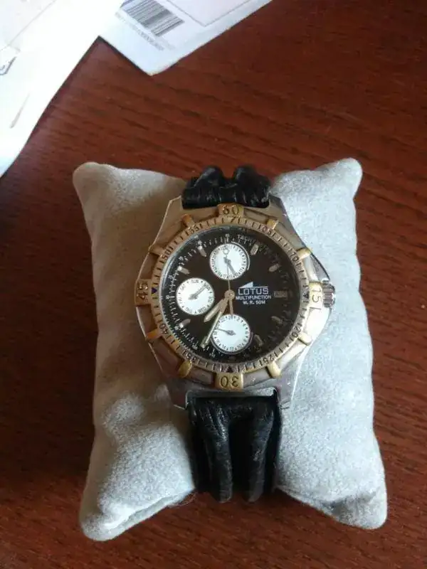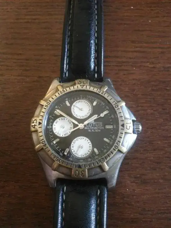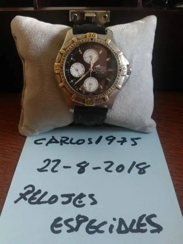 Hola compañeros vendo este lotus VINTAGE años 90 esféricas panda reverse, calendario completo con mes día del mes, dia semana y contador de 12/24 horas, maquinaria miyota con todas las funciones funcionando perfectas, cristal mineral nuevo, y bisel unidireccional con todos sus cliks,se entrega con la correa negra hirst de pespuntes blancos, el motivo de venderlo es que tengo dos muy parecidos y uno tiene que salir, la verdad es que el reloj es superllamativo y no pasa desapercibido