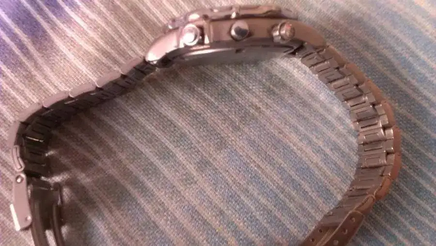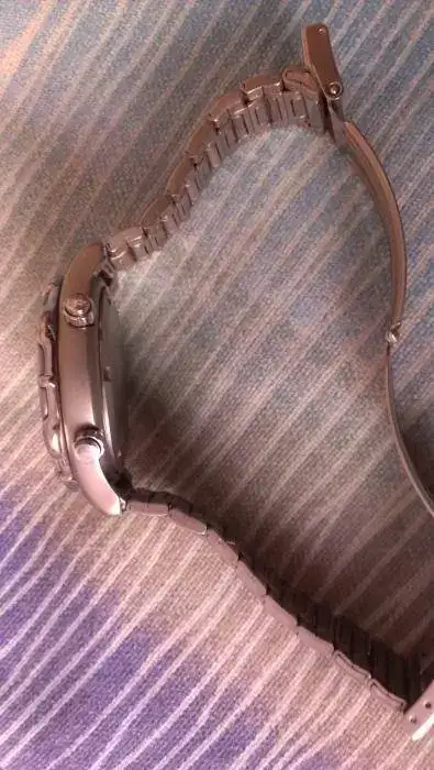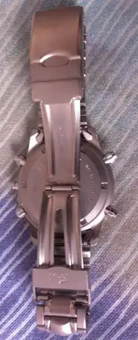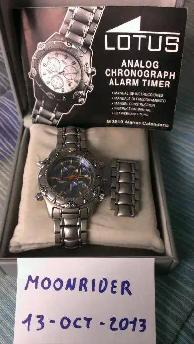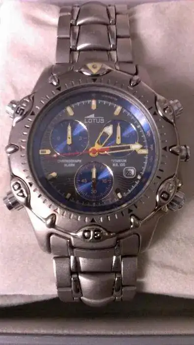 Lotus Titanium del año 1999, 40mm de diametro, crono y alarma, cristal mineral y todo realizado en titanio, el reloj muestra marcas de uso inevitables en este material, tambien presenta leves rayones superficiales en el cristal y en el bisel algunos de los numeros han perdido su pintura negra, resalto todo esto porque no quiero ningun malentendido, pero a mi juicio el reloj para sus años se encuentra en un estado muy bueno, tiene todos sus eslabones sobrantes, caja original y libro de instrucciones, funciona correctamente y es con diferencia el reloj mas ligero que he tenido.