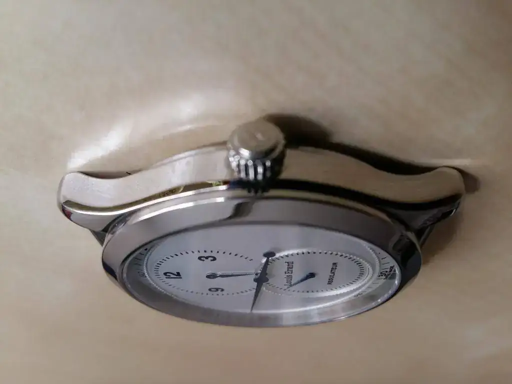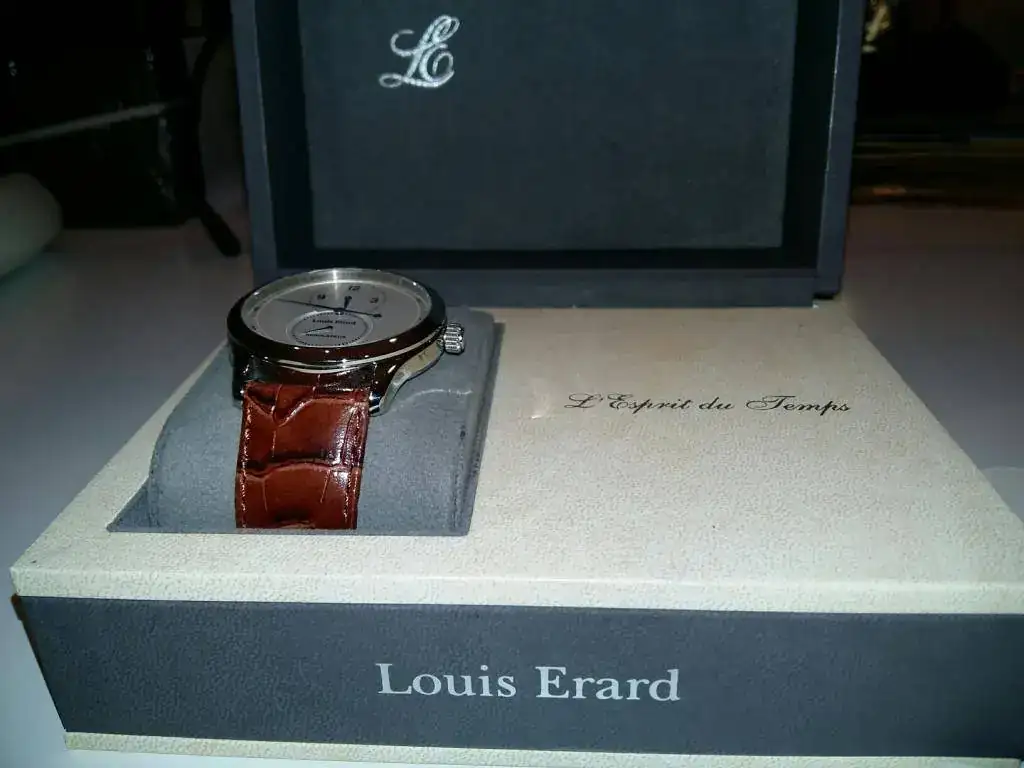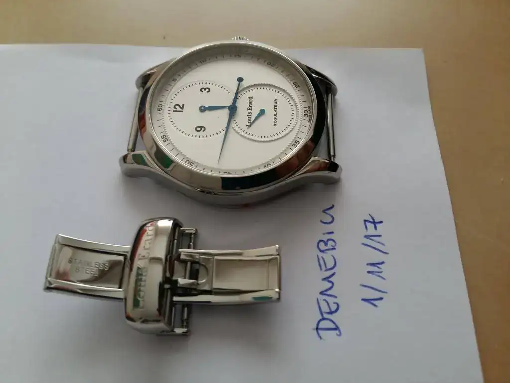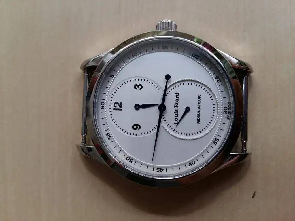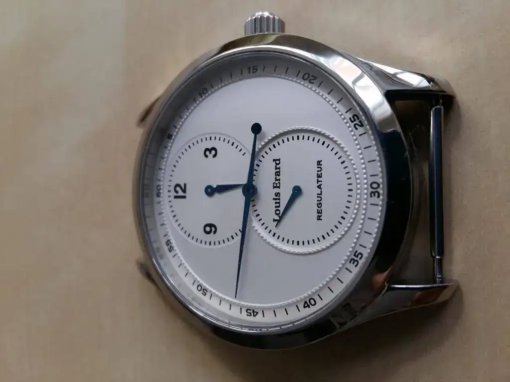 Vendo un, para mi gusto, muy bonito reloj con una complicacióntambién muy bonita. Se trata de un regulador de Louis Erard. Como sabéis, losreguladores eran relojes patrón precisos con una legibilidad clara, usados enlas relojerías. A mí me gusta mucho la distribución de agujas descentradas queda esta legibilidad, y en particular la limpia esfera blanca con índicesarábicos y agujas azuladas de éste