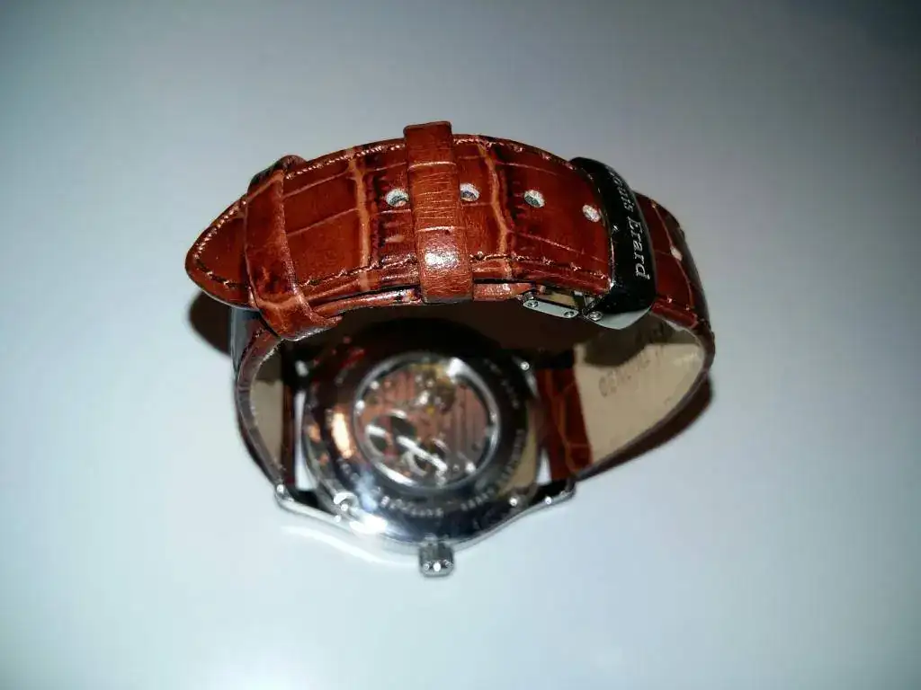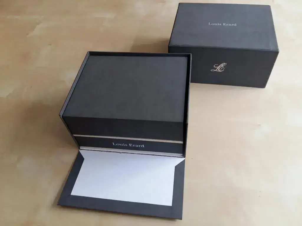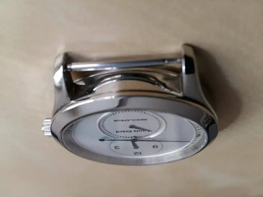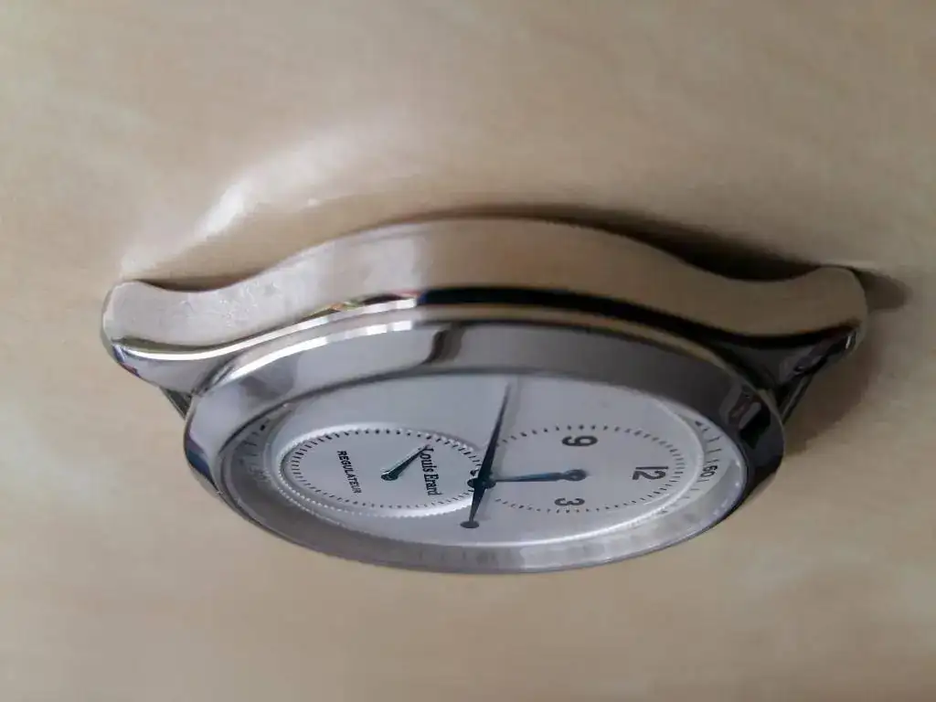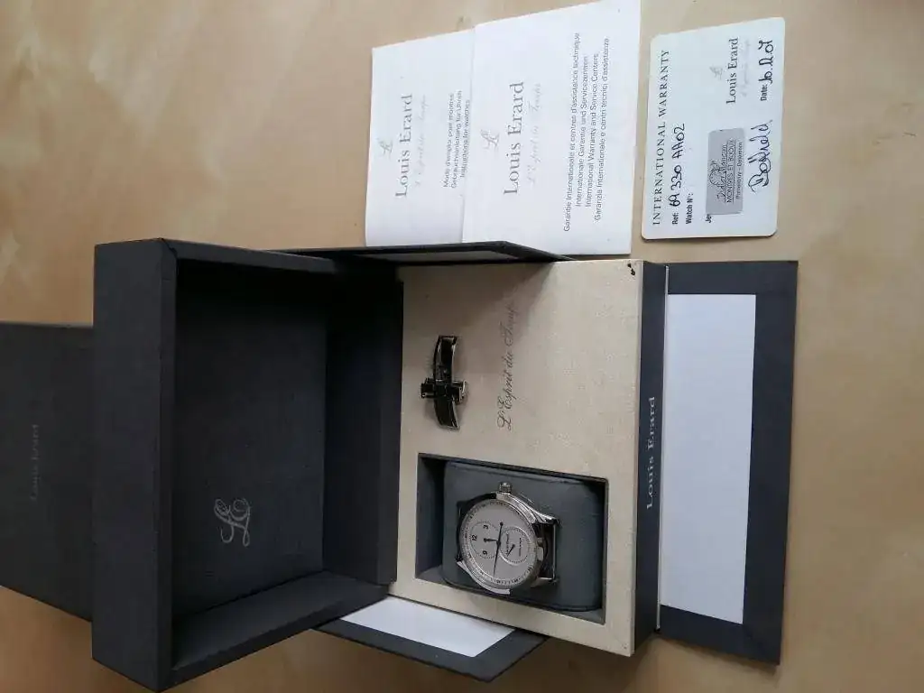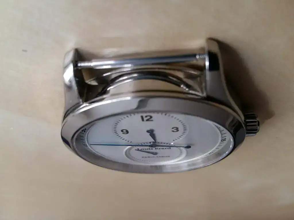 Vendo un, para mi gusto, muy bonito reloj con una complicacióntambién muy bonita. Se trata de un regulador de Louis Erard. Como sabéis, losreguladores eran relojes patrón precisos con una legibilidad clara, usados enlas relojerías. A mí me gusta mucho la distribución de agujas descentradas queda esta legibilidad, y en particular la limpia esfera blanca con índicesarábicos y agujas azuladas de éste