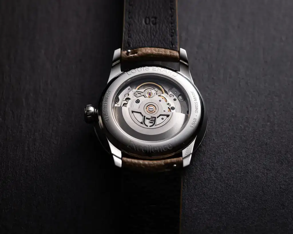 En Louis Erard han reinventado la emblemática esfera en sectores, característica de la relojería de los años 30, al tiempo que incorporan su característico diseño Régulateur con la visualización vertical de los indicadores de la hora. Esta precisión técnica y estética pone de relieve los elementos clave: segmentación horaria, legibilidad optimizada, círculos concéntricos y un motivo de vía de tren en el perímetro.