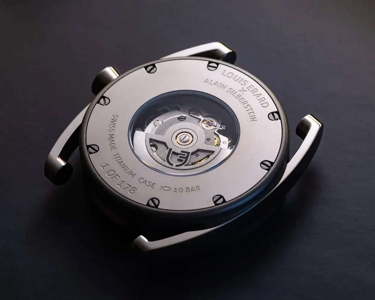 Titanio de grado 2 microgranallado y titanio de grado 5 pulido Ø 40 mm, Entre asas: 22 mm, Lug-to Lug: 47 mm, Grosor: 11,60 mm. 2 piezas, cristal de zafiro con tratamiento anti-reflejos en ambas caras, fondo visto, resistencia al agua de 100 metros. Corona Alain Silberstein lacada en rojo con el logo de Louis Erard. Fondo grabado con "Louis Erard x Alain Silberstein 1 de 178"