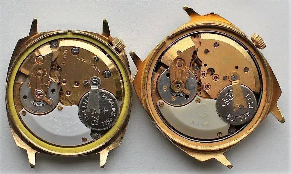 En la página web del especialista en Junghans, el Sr. Harmut Wynen2 corroboramos esta información. Sin embargo en el artículo(en idioma ruso del original) del live journal3 el redactor, Sr. Tgarish en una interesante y bien documentada visión de la relojería electrónica soviética señala la más importante diferencia entre ambos calibres: Sus alternancias : Las del Luch 3045 suben a 4Hz o lo que es lo mismo a 28800 A/h. Aquí radica la principal diferencia entre ambos calibres; el caso es similar al del conocido poljot 3133 crono mecánico, que derivaba de las patentes del valjoux y que mejoraron ostensiblemente1 Si nos atenemos a esta imagen, extraída del artículo del Sr. Tgarish, vemos que los calibres son prácticamente iguales, solo cambia la disposición de la corona en el Junghans que está fijada a las 4h.