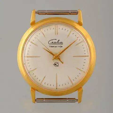 Al mismo tiempo apareció el Slava transistor, primer y único reloj con diapasón fabricado en la unión soviética. Es conocida la anécdota en la cual se relata que Nikita Khrushchev se trajo consigo a la vuelta de su viaje a estados unidos un Bulova Accutron 2141, para que los ingenieros soviéticos lo copiasen literalmente. Sinceramente esta historia me parece poco probable, pero no se puede negar que el calibre del Slava es una copia literal del Bulova. Y que esta demandó a la unión soviética por ursurpación de patentes. Este hecho a mi parecer a denostado durante demasiado tiempo a la industria soviética relojera y en más de una ocasión se ha tergiversado la misma de manera aberrante e ilógica. Afortunadamente tenemos una valiosísima información gráfica del Slava transistor en un vídeo promocional2 de la misma Slava.