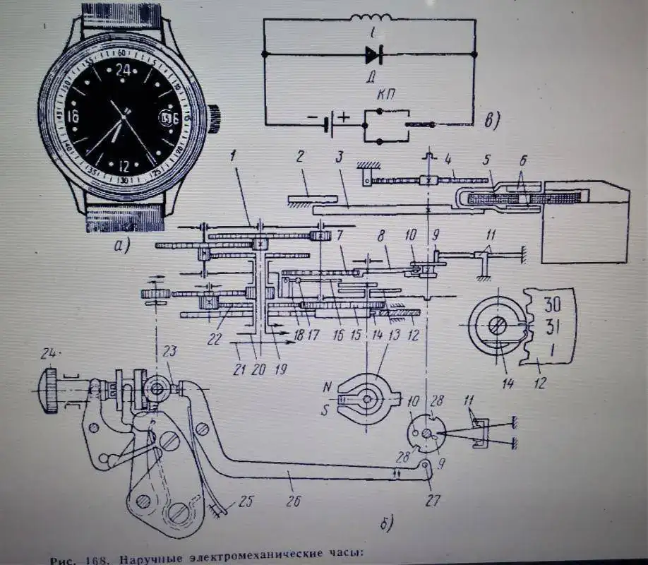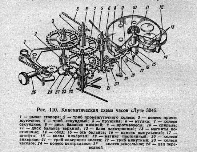 Extraído del libro, en original ruso del Sr. Kharitonchuk1 Устройство и ремонт часов, 1980 — А.П. Харитончук que en una traducción aproximativa a nuestro idioma, sería algo así como “los dispositivos(del tiempo) y su reparación”, extraigo este esquema donde se ven los elementos y su disposición que forman el Luch 3045 http://ussr-watch.com/repair/