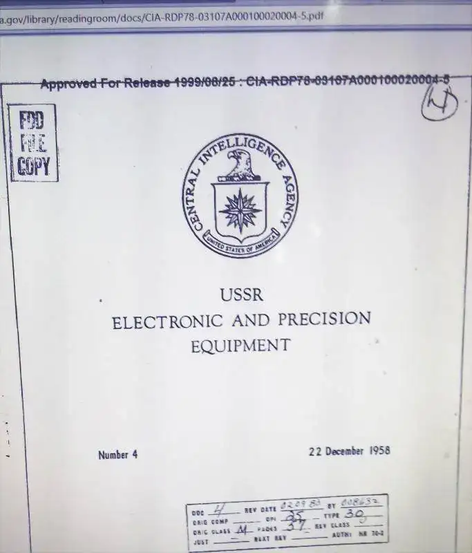 ser mecánica y la posible prioridad por sacar a la palestra dispositivos de cuarzo en años posteriores, “congelaron” por así decirlo todos estos interesantes proyectos. Hago este pequeño inciso para poner en duda todas las afirmaciones más corrientes, de que la USSR se limitaba a copiar patentes y tecnología occidental. Aunque hubiese un telón de acero entre occidente y la unión soviética, el flujo de información era presente entre los dos bloques, ya fuese por vías oficiales (compra de patentes)1 o por otras vías, como prueba este interesante y desclasificado documento de la CIA titulado “ USSR ELECTRONIC AND PRECISIONS EQUIPAMENTS” donde hace referencia a la tecnología eléctrica, las primeras computadoras para comprobar los Sputniks y tiene un curioso apartado, dedicado a la relojería.