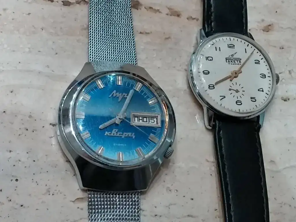 Pues eso chicos, vendo esta magnífica y rara pieza de la marca rusa luch. El calibre es el Luch 3055, que es parecido al Junghans 600 Ato-Chron. Combina dos movimientos. El estado es realmente bueno, aunque tiene sus marcas lógicas debido a la edad. La marcha es impecable. Es una pieza con un dial en un azul precioso, en un estado muy bueno, aunque con marcas comprensibles por la edad.