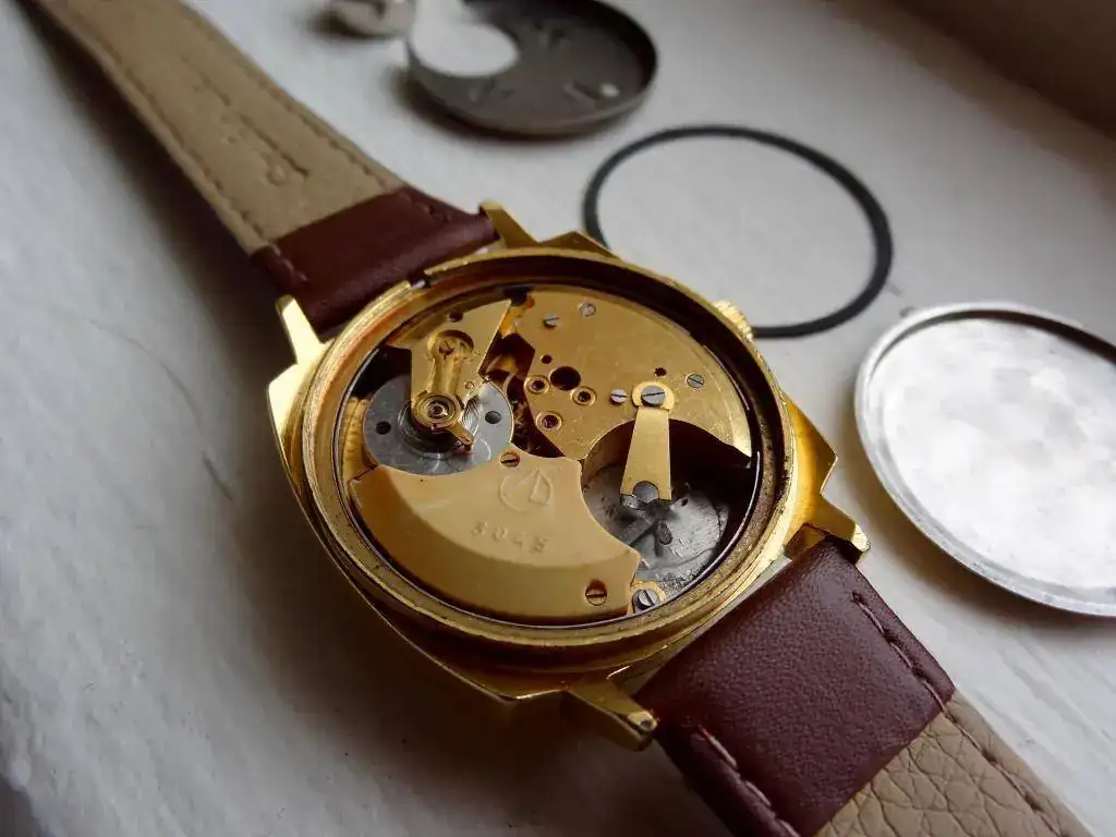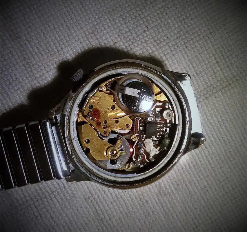 Pero volvamos a Luch: es a mediados de los 70 cuando Luch lanza su calibre 3045, muy parecido o clon, del Junghans Ato-Cron (desconozco si esta última vendió las patentes a la USSR o fue un "prestamo". https://www.crazywatches.pl/junghans-electronic-600-dato-chron-1970. Esta foto pertenece al calibre luch 3045, que se trataba de un reloj transistorizado, muy bonito esteticamente y también muy difícil de encontrar hoy en día en estado funcional.